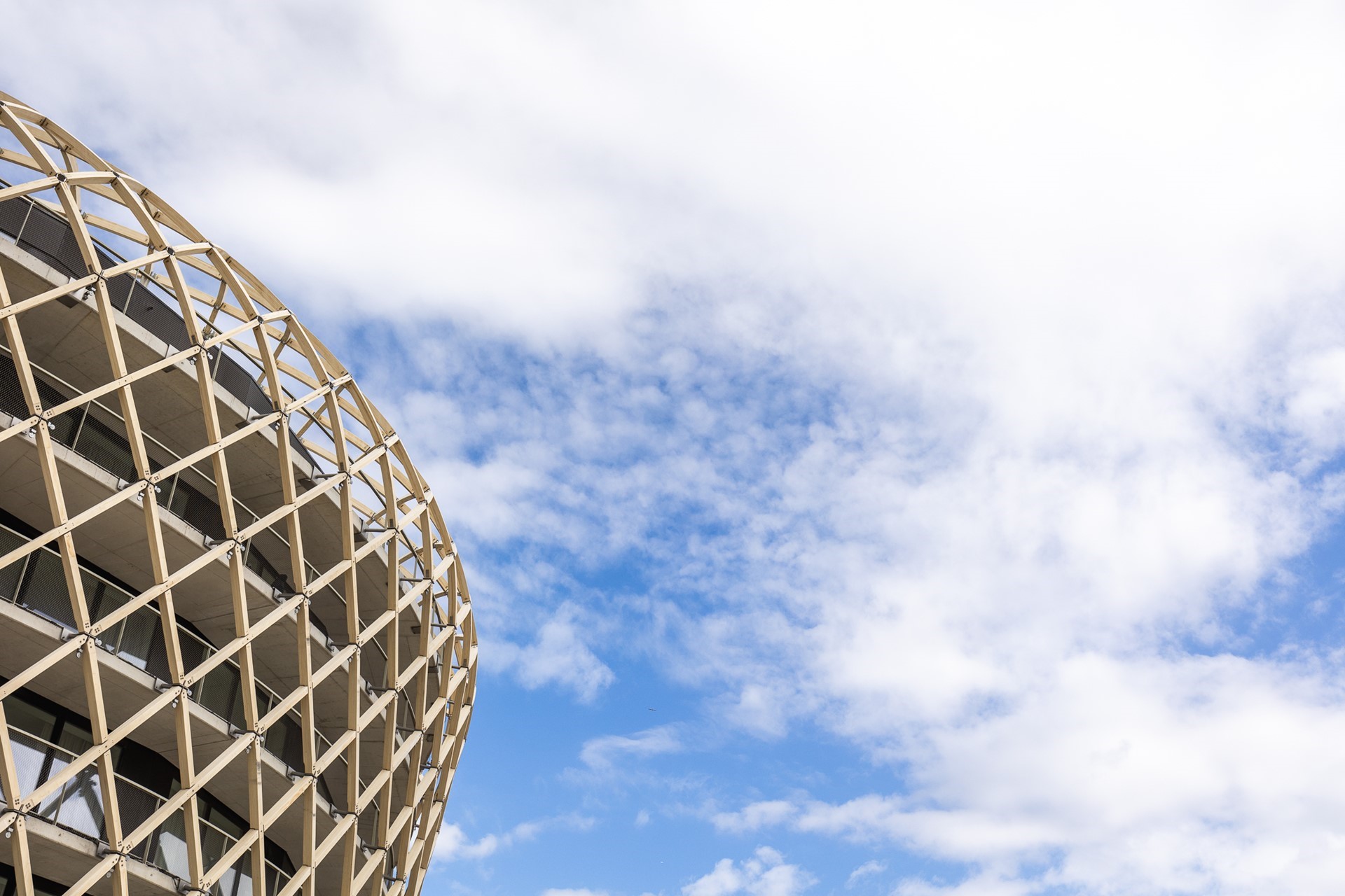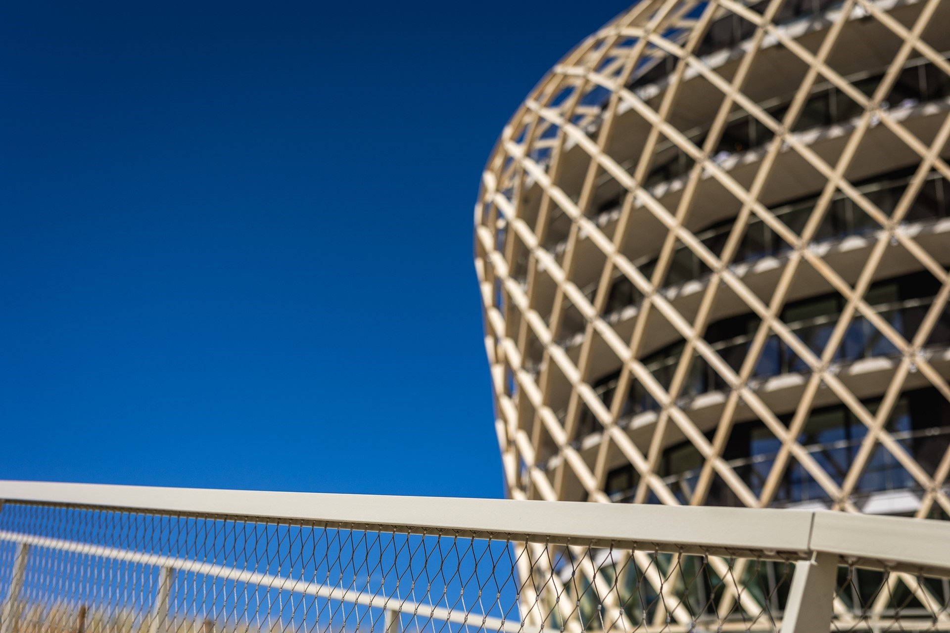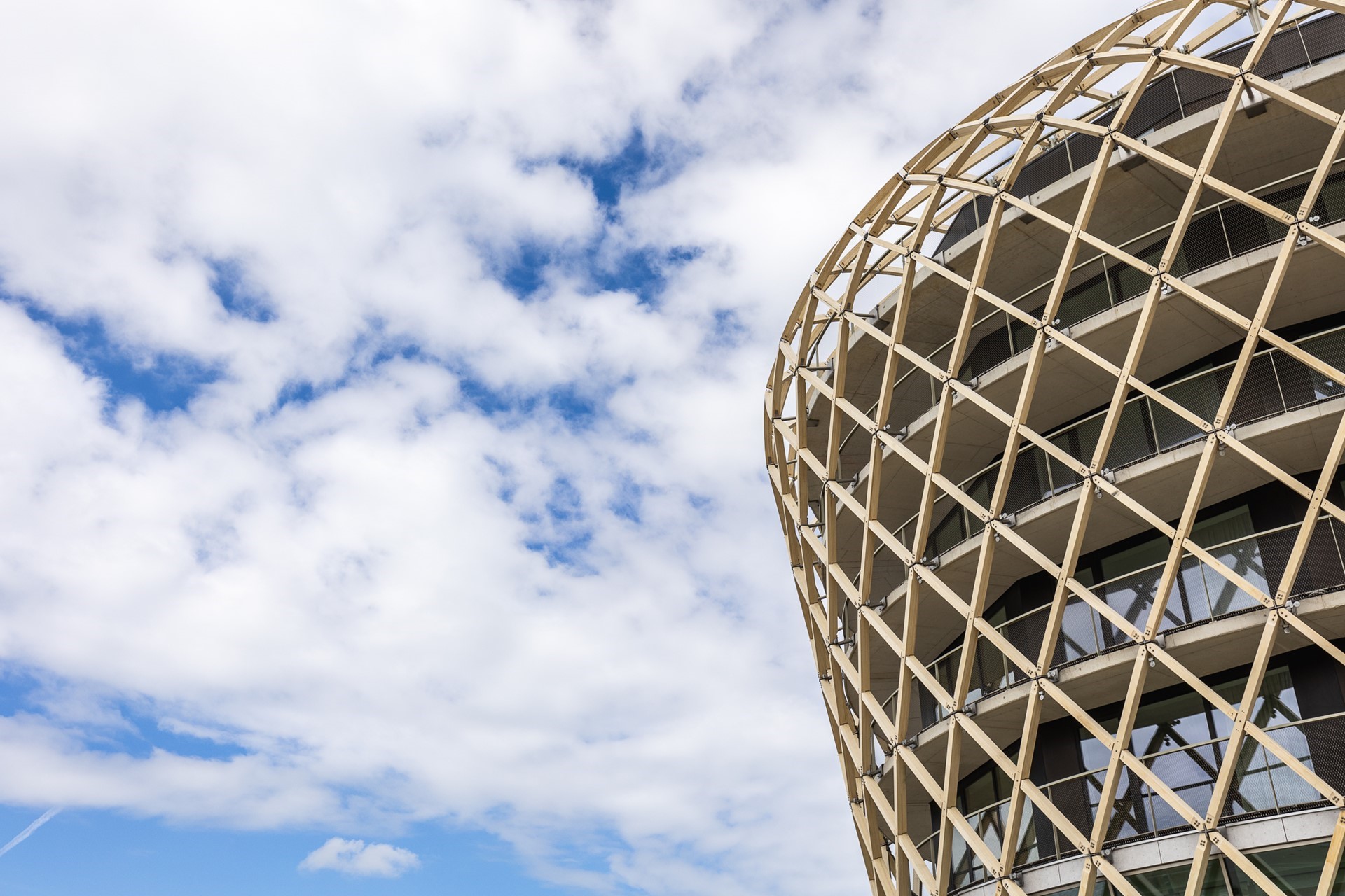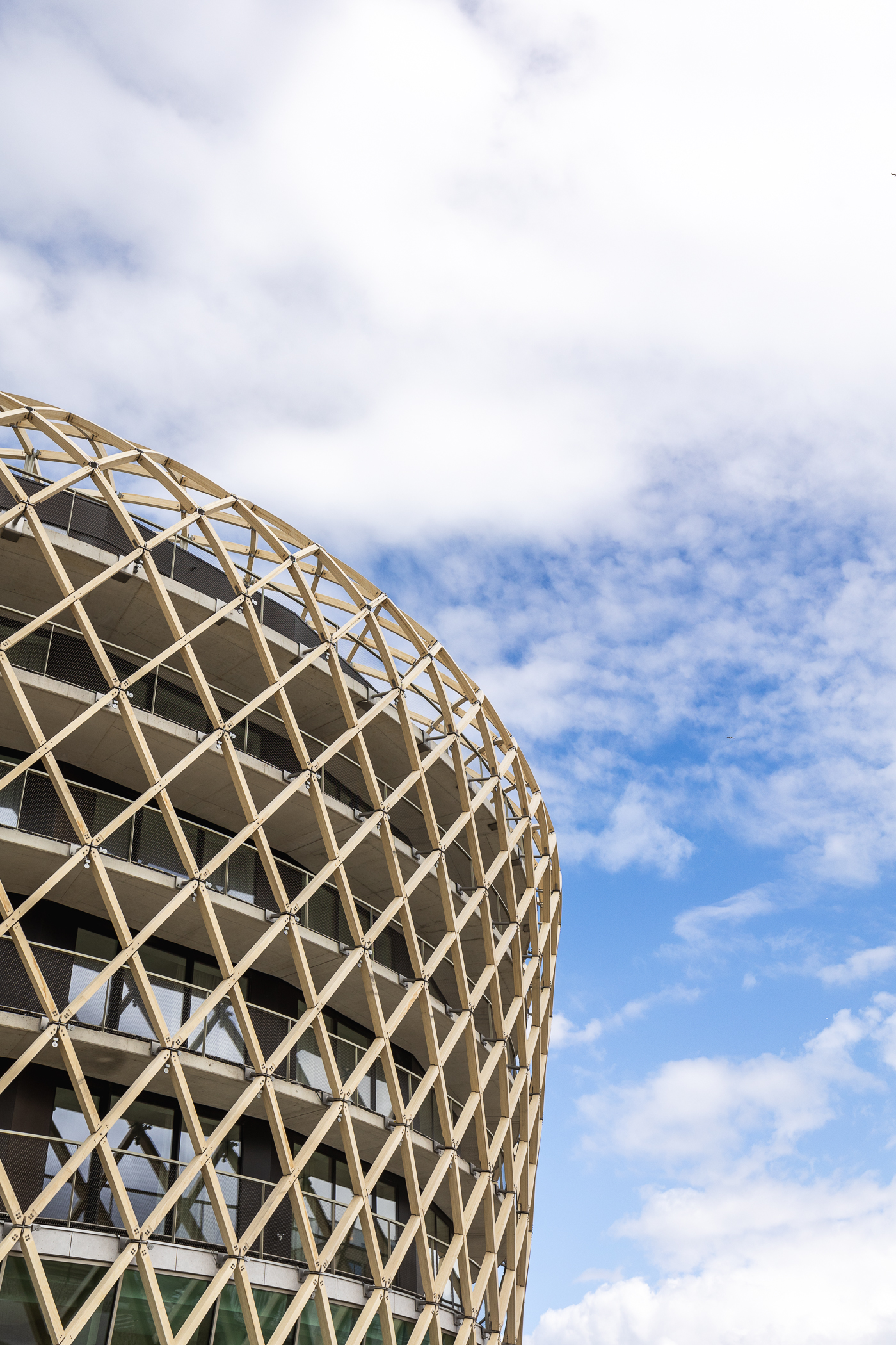 Een andere bijzondere uitdaging was het modelleren en installeren van de overgangszone tussen de gevel en het dak. “De geometrie op die plek vertoont een eenvoudige puntsymmetrie. Dit betekent dat van de 600 houten en 1000 stalen onderdelen slechts twee stuks exact hetzelfde zijn. Identificatie, voormontage en montage… een heus logistiek kluwen. Dat gold eigenlijk voor het gehele bouwproces, van de planning van de productiecapaciteit, het schaven van de ruwe lamellen, het verlijmen van de balk tot het frezen in de CNC-machine en de voormontage van de bevestigingsmiddelen en stalen onderdelen in de fabriek”, geeft HESS TIMBER aan.