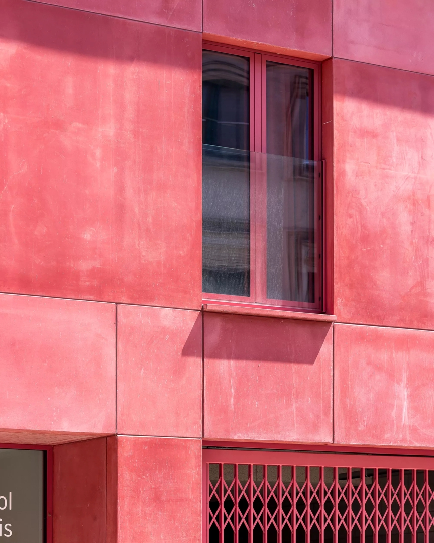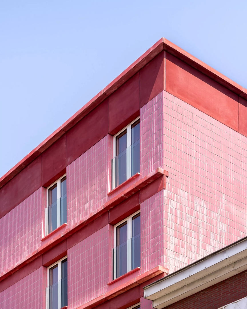 De nieuwe bouwmassa langs de Nieuwebosstraat verlengt en verfijnt het bestaande straatprofiel dat begint aan het Sint-Annaplein en doorloopt tot aan de school op de hoek. In deze uitgesproken stedelijke context schenkt luum bijzondere aandacht aan de inpassing in het straatbeeld. De gevel zoekt bewust een evenwicht tussen aansluiting en eigenheid: de ritmiek en materialisatie refereren subtiel aan de omgeving, terwijl de opvallende donkerroze tint het gebouw een hedendaagse, zelfverzekerde aanwezigheid geeft die breekt én verbindt.