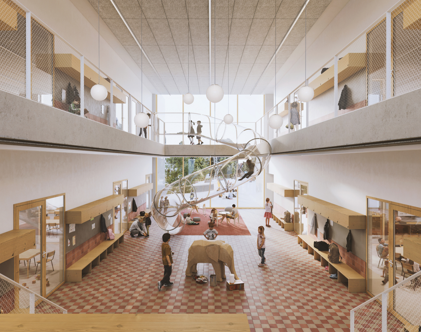 Ook typologisch kiest a2o architecten resoluut voor een ander schoolmodel. Klassieke gangen en afzonderlijke trappen maken plaats voor een organisatie waarbij klaslokalen rond open leerzones liggen die zich over meerdere verdiepingen uitstrekken. Die opzet bevordert ontmoeting, overzicht en flexibiliteit en laat toe om het gebouw in de toekomst eenvoudig aan te passen aan veranderende onderwijsnoden.