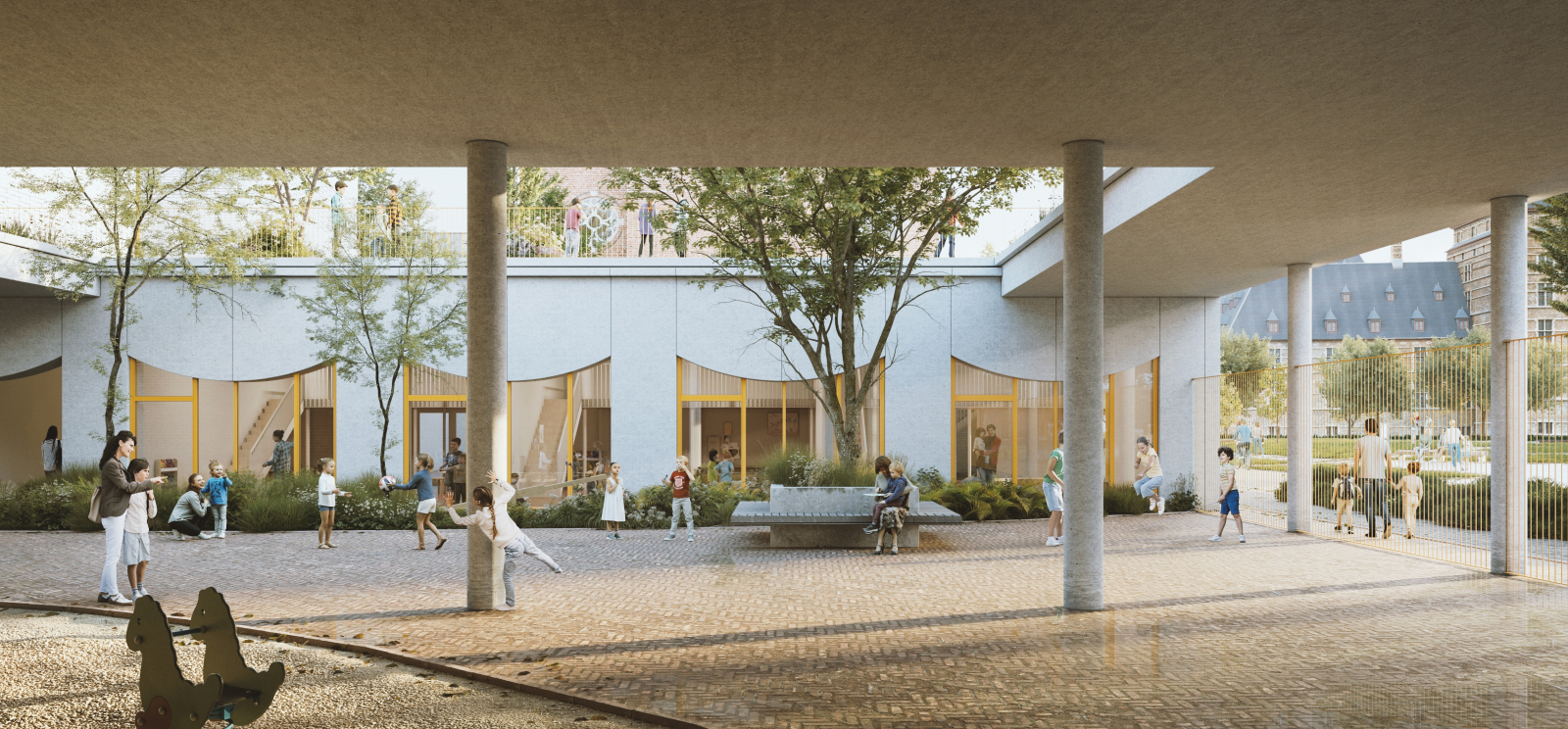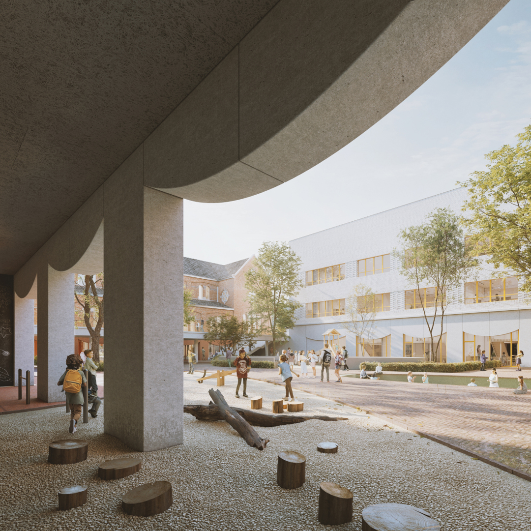 Achter de bestaande gebouwen worden twee compact georganiseerde schoolvolumes ingeplant. Hun positionering bewaart belangrijke doorzichten en zorgt ervoor dat de nieuwbouw zich respectvol inschrijft in de context. In plaats van te domineren, ondersteunen de volumes het bestaande verhaal van de plek en dragen ze bij aan een leesbaar en evenwichtig geheel.