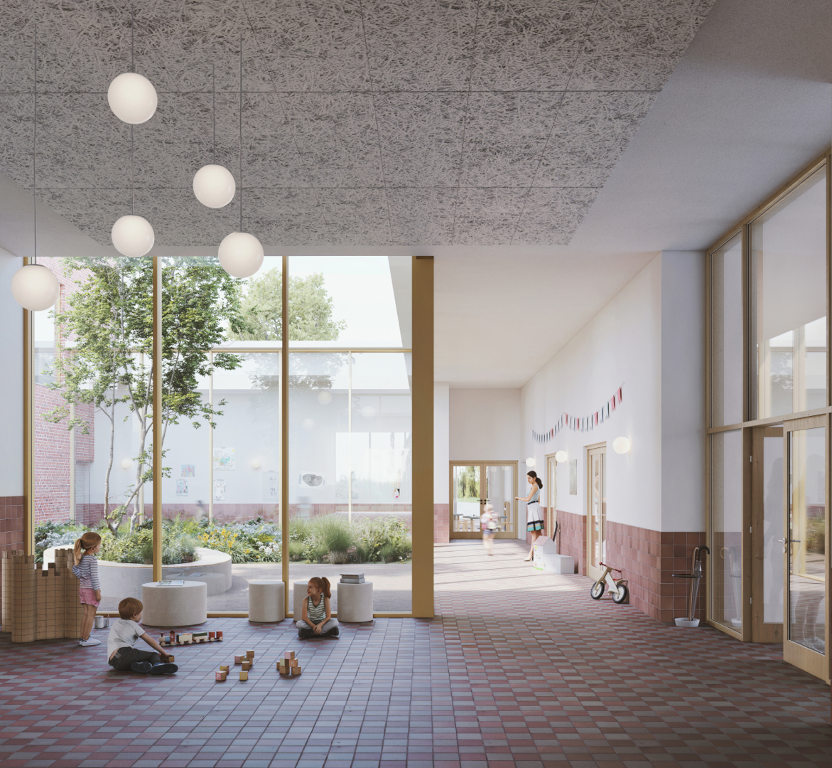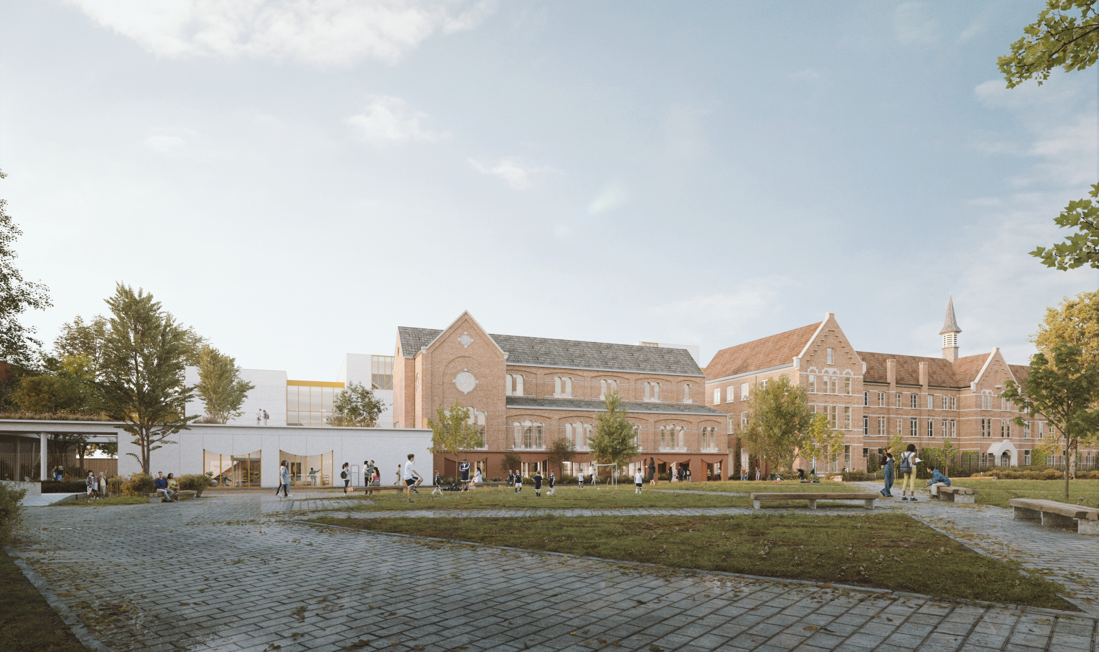 Het ontwerp bouwt verder op wat al aanwezig is en versterkt de samenhang van de site. Bestaande gebouwen blijven behouden, een voormalige kapel krijgt een nieuwe invulling en nieuwe voorzieningen voor kleuter- en lager onderwijs vervolledigen het programma. Die ingrepen worden niet als losse toevoegingen opgevat, maar als een gelaagde en coherente voortzetting van het geheel, met aandacht voor schaal, zichtlijnen en ruimtelijke continuïteit.