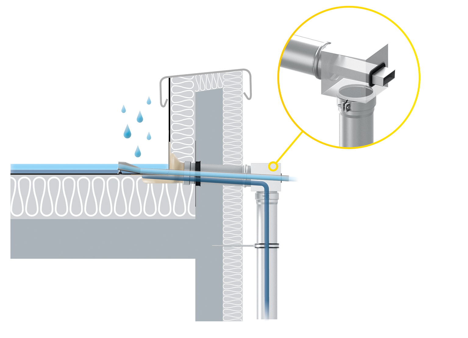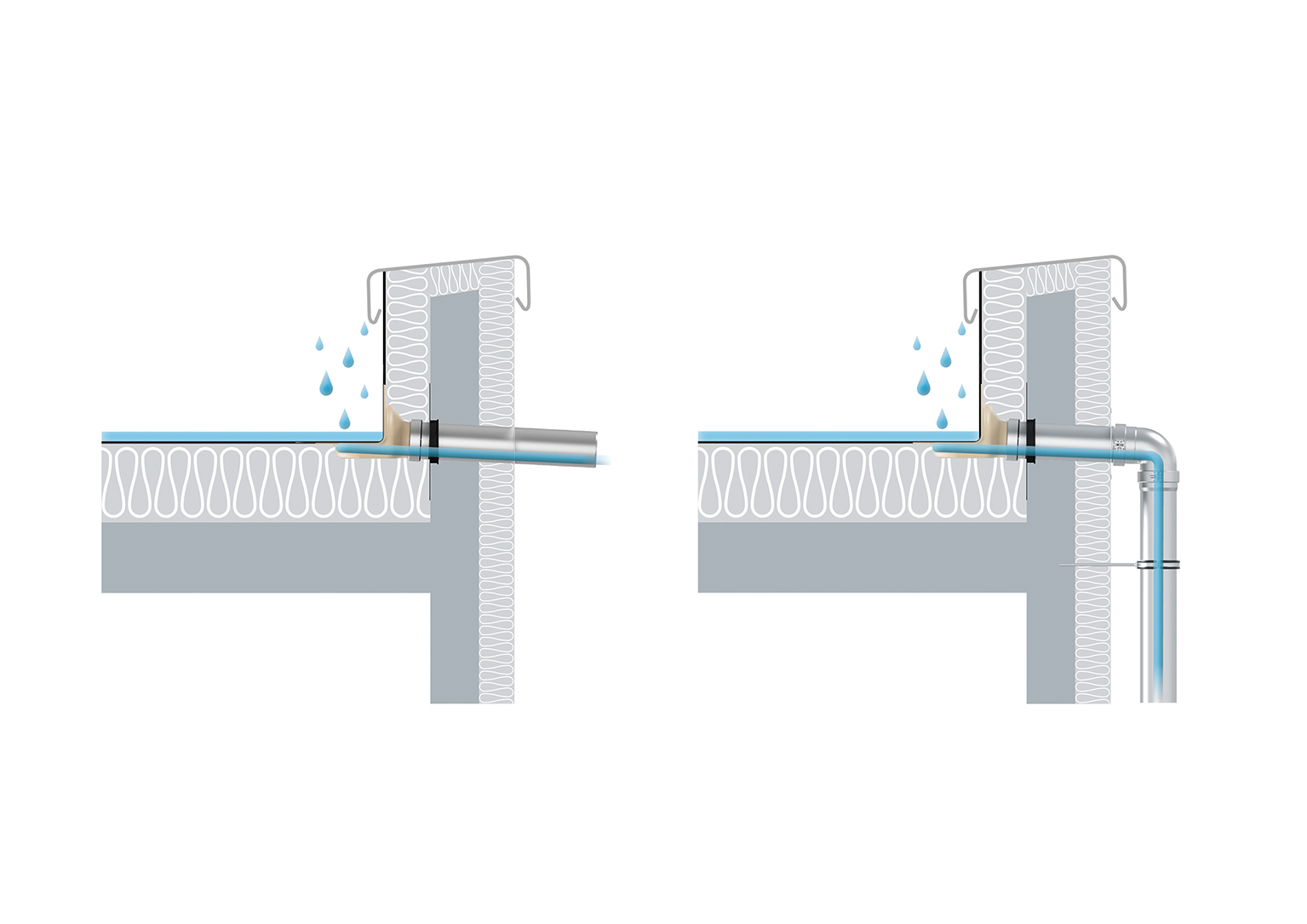 - Als spuwer of aangesloten aan de regenbuis: de SitaVasant heeft een hoge afvoercapaciteit ondanks een afvoer die slechts 48 mm hoog is en slechts minimale impact heeft op de thermische isolatie (3).