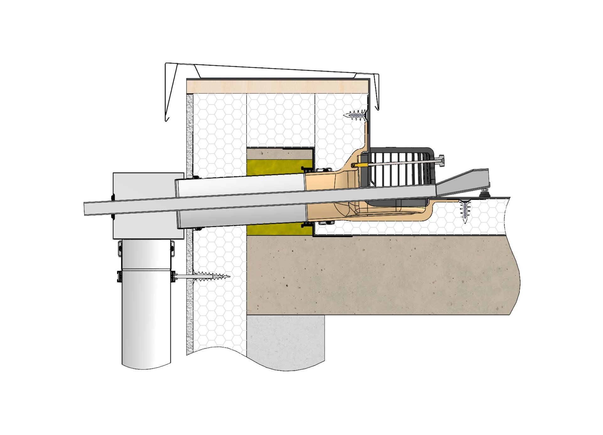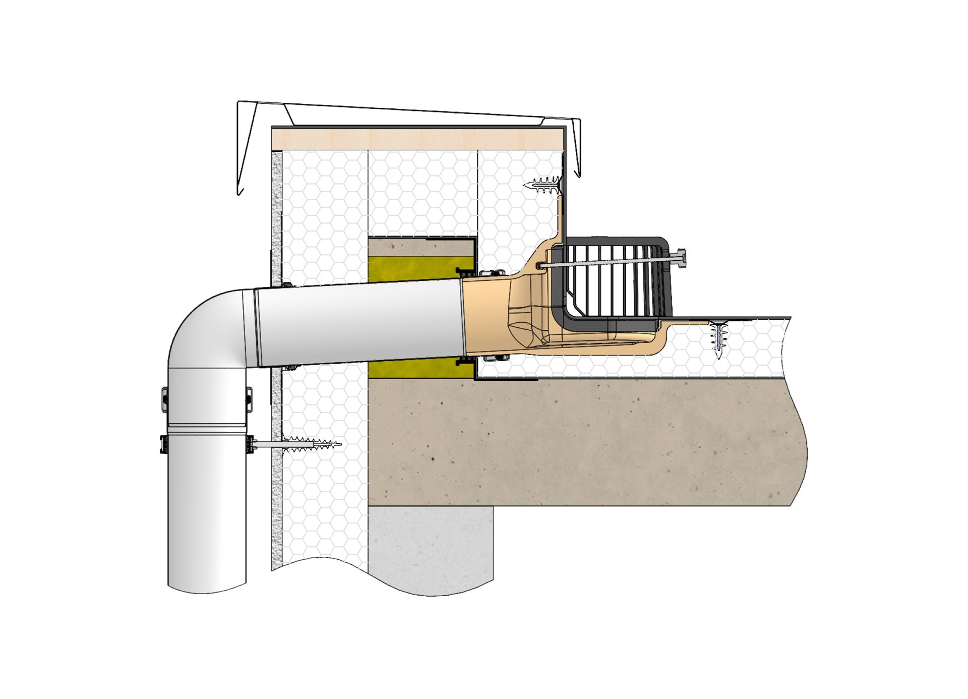 De noodafvoer wordt dan vanaf de dakzijde ook door het overgangsstuk gevoerd tot het de spuwer positie bereikt heeft. Deze noodafvoer wordt steeds geleverd met een bijpassende rechthoekige afdichting, die zorgt voor een zorgeloze integratie in de opstand.