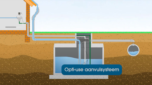 Hoewel bij dit project gekozen werd voor een manueel hergebruik van regenwater, biedt ecobeton ook een automatisch hergebruiksysteem aan: de Opti-use. Dat gebruiksvriendelijke systeem vult de tank automatisch bij wanneer die leeg raakt, tot maximaal 55 liter per keer. Het resultaat? Extra comfort en nog meer besparing op leidingwater.
