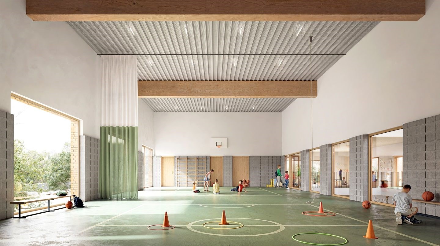 De kleuters krijgen op het gelijkvloers een eigen, geborgen wereld, met directe toegang tot buitenruimte en een beschut kleuteratrium. Op de eerste verdieping liggen de leerlandschappen voor de lagere school, verbonden door een ruim atrium dat binnen en buiten met elkaar verbindt. De sportzaal bevindt zich eveneens op de eerste verdieping, terwijl de multifunctionele feestzaal op het gelijkvloers ligt. Zo ontstaat een schoolgebouw dat beweging en ontmoeting stimuleert, met een sterke focus op flexibiliteit en beleving.