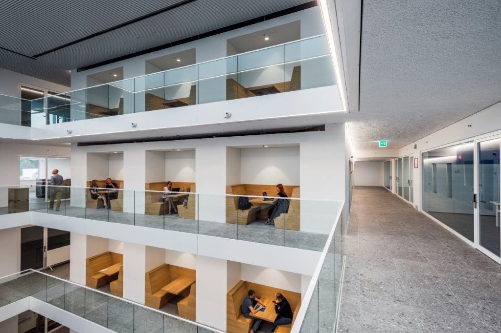 Op enkele houtaccenten, huiselijkere bureau-eilandjes en diverse vloerbekledingen na, is er sprake van cleane, witte interieurs. De heldere vormgeving versterkt het effect van de riante natuurlijke lichtinval, net als de open zichtlijnen die zich overal in het gebouw manifesteren. Een ander markant gegeven is dat de omvangrijke T2-campus op amper achttien maanden tijd is opgetrokken en dat het prefabpercentage op 85 % lag – een zeldzaamheid in ons land.