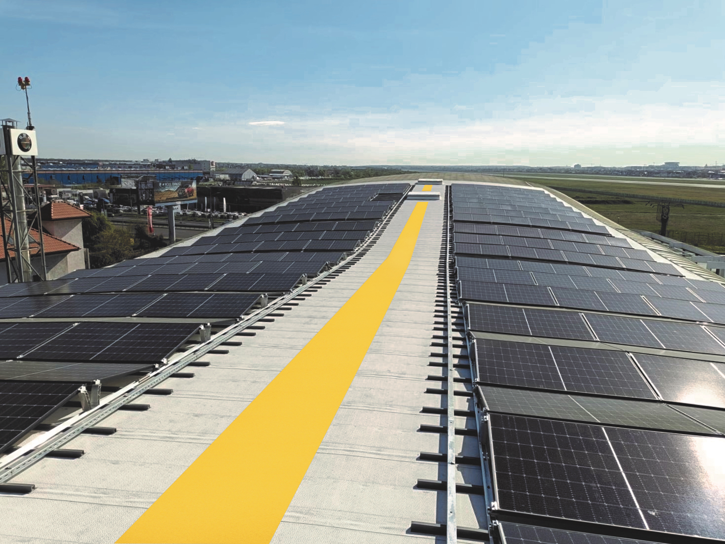 De Walkway-oplossing werd ontwikkeld als een flexibel synthetisch PVC-membraan met polyesterversterking. Het systeem creëert veilige looproutes op daken en maakt onderhoud en inspecties eenvoudiger en veiliger.