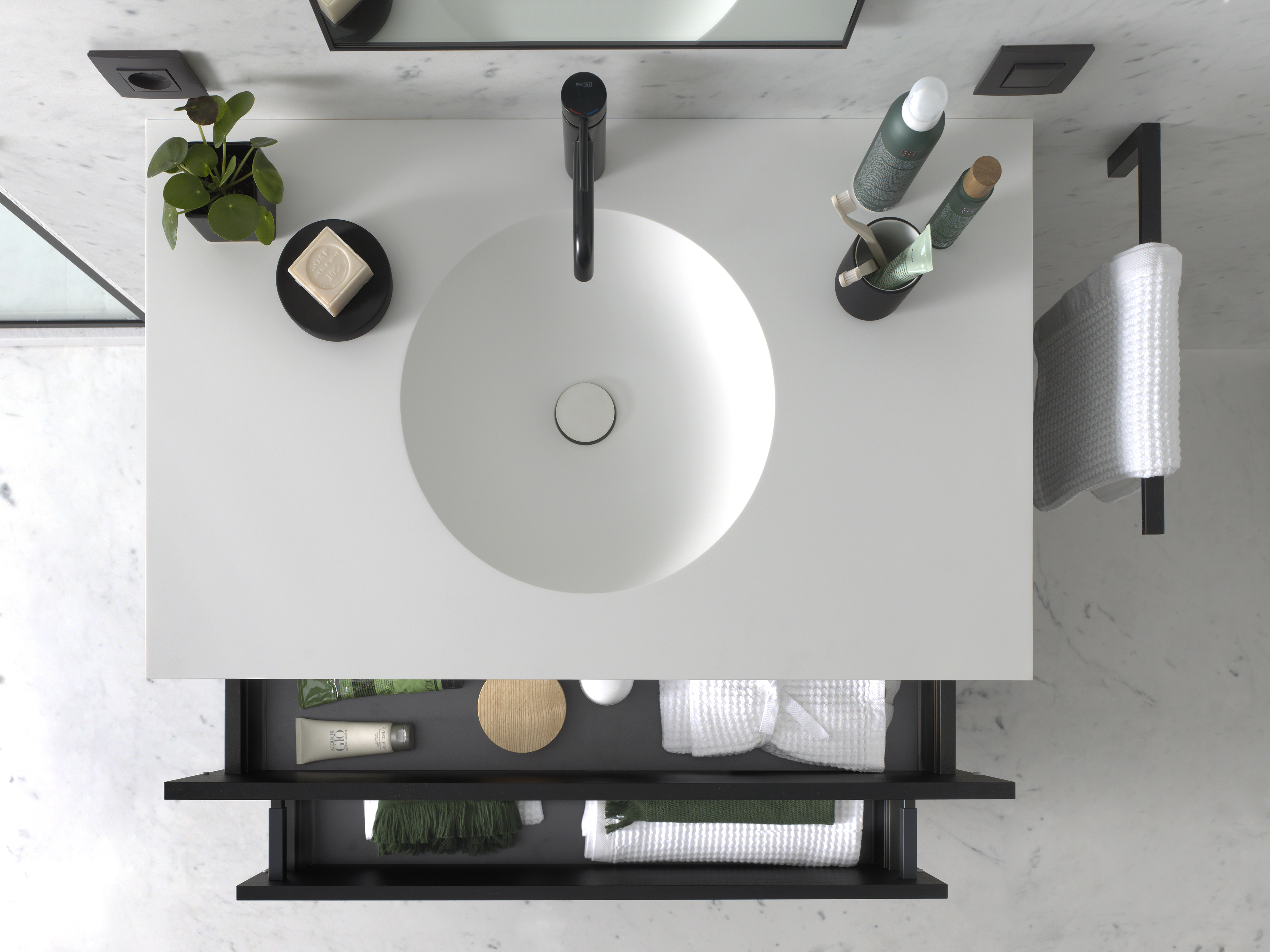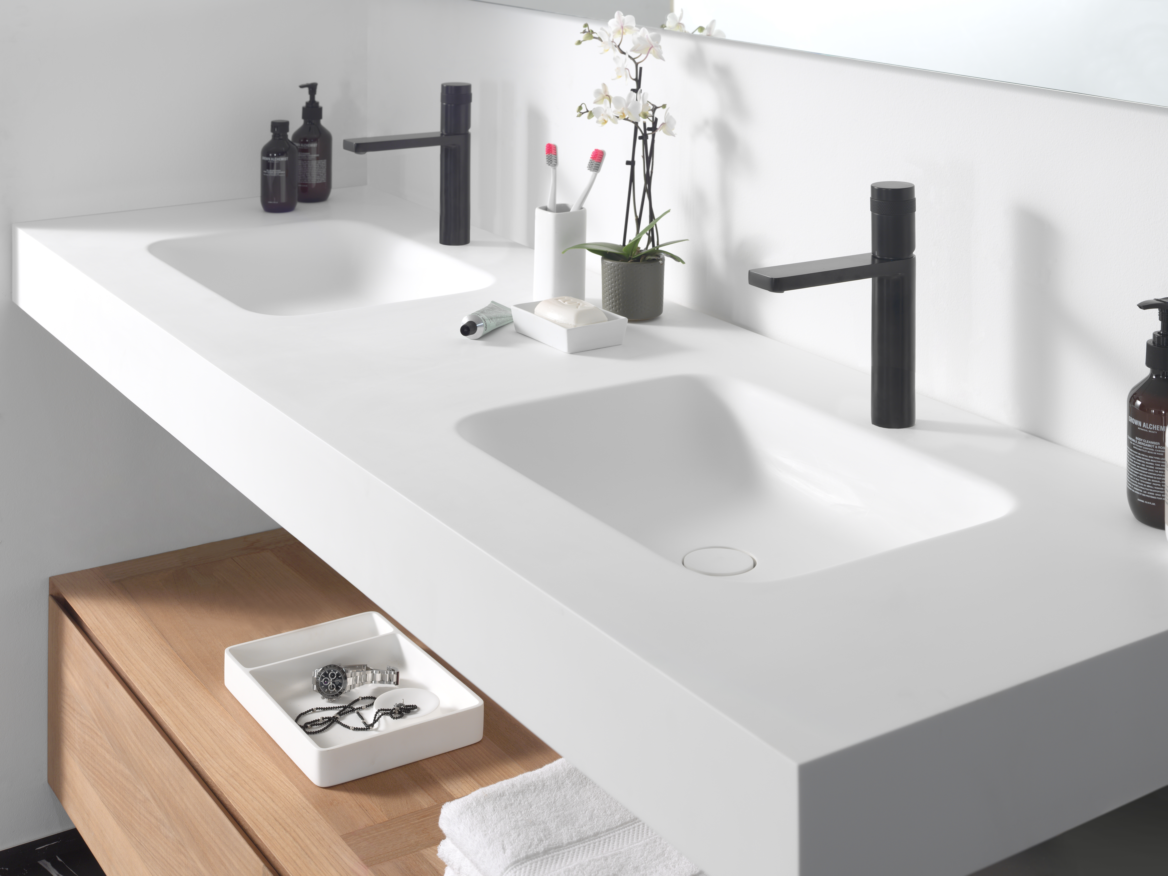Omdat solid surface met behulp van een mal geproduceerd wordt, kan het als een kameleon bijna alle vormen en gedaantes aannemen. Solid surface blinkt zo uit als veelzijdig materiaal dat zijn weg vindt in waskommen, baden, douchebakken en douchewanden. Telkens zijn strakke randen en naadloze overgangen kenmerkend. Hou je ervan om je accessoires af te stemmen op de rest van je badkamer? De luxueuze solid surface accessoires passen in elke badkamer en hebben een tijdloos, minimalistisch design.
