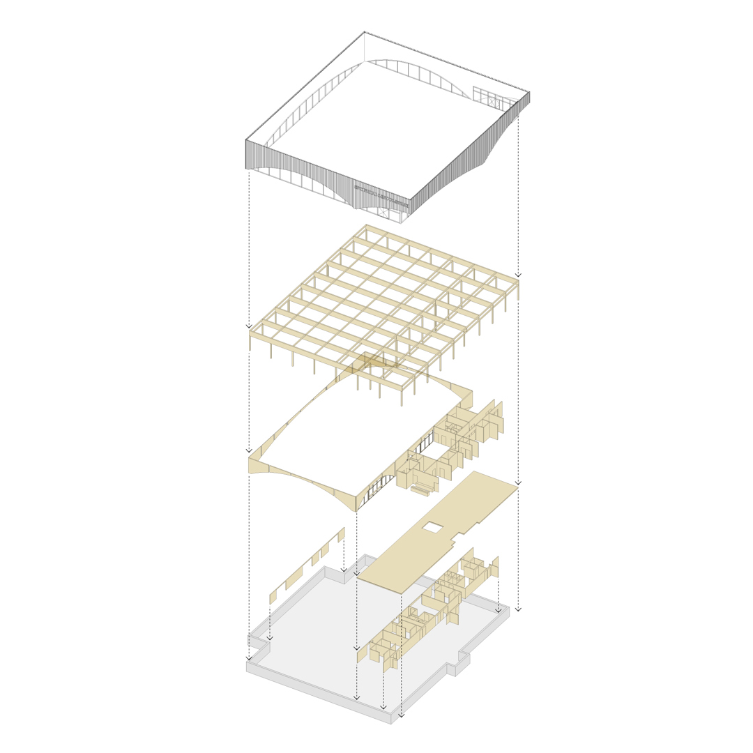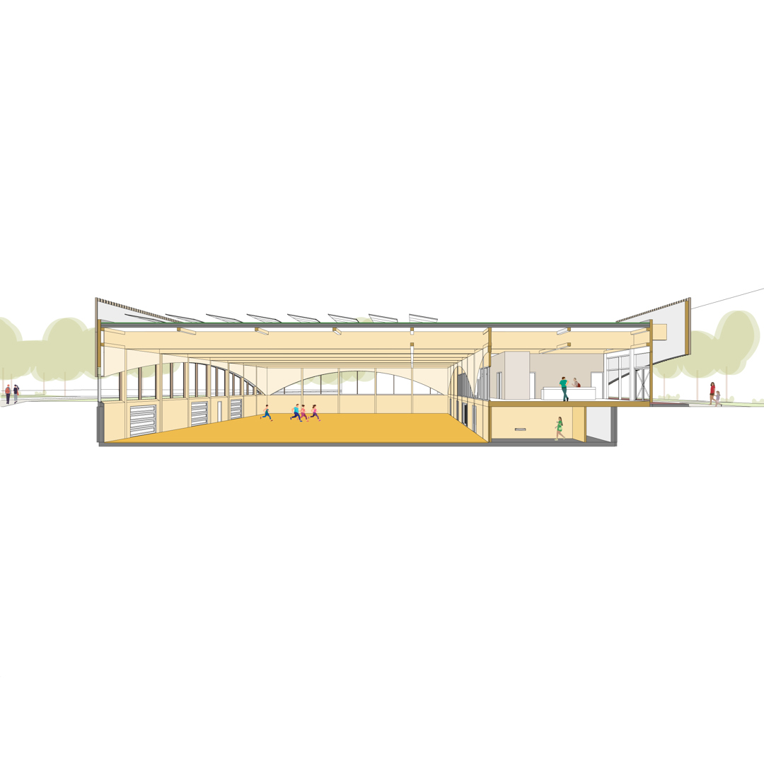 Door de sportvloer te verdiepen, ontstaan bovendien op maaiveldniveau openingen die binnen en buiten met elkaar verbinden. Voorbijgangers krijgen zicht op de activiteiten binnen, terwijl gebruikers contact houden met de omgeving.