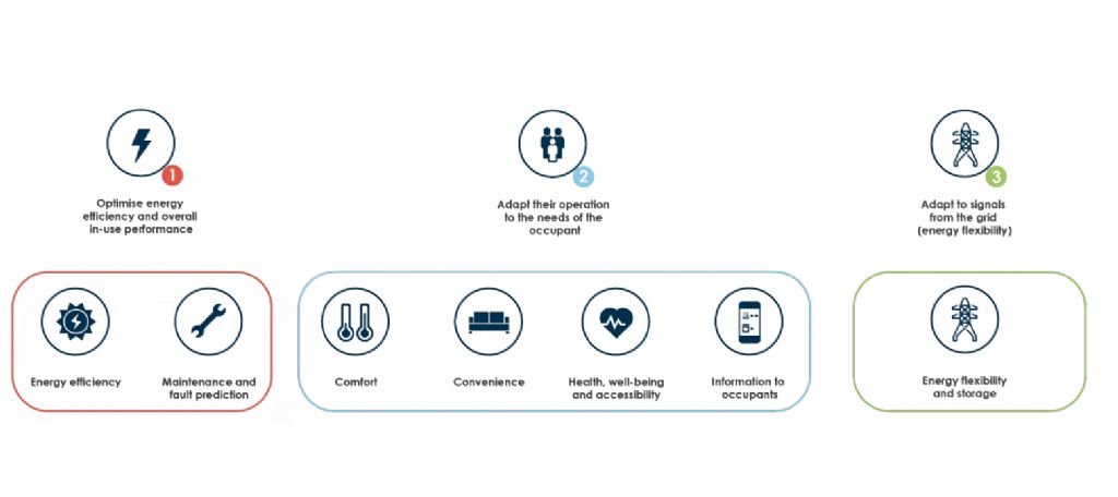 De SRI is een concept dat werd ingevoerd in het kader van de Energy Performance of Buildings Directive. Het werd in opdracht van de Europese Commissie verder ontwikkeld door een consortium met het Belgische onderzoekscentrum VITO aan het hoofd. “Het is een hulpmiddel dat enerzijds het (gebrek aan) smart potentieel in een gebouw kan blootleggen en anderzijds een marktstimulans voor innovatie kan zijn”, verduidelijkt Wim Boone. “Het basisbeginsel van de SRI is drieledig. Naast het optimaliseren van de energie-efficiëntie, wordt ook de mate waarin het gebouw kan inspelen op de noden van de gebruikers en kan reageren op signalen uit het net meegenomen. Op die manier sluit het nauw aan bij de focusdomeinen die aan ‘smart buildings’ worden gelinkt. In de eerste plaats spreken we over ‘comfort & convenience’ of de mogelijkheid om op een vraag van de gebruiker te reageren. Tweede in het rijtje is ‘energy efficiency performance & operations’ of het intelligente beheer en gebruik van energie en middelen. Daarnaast is er nog ‘energy flexibility’ of de mate waarin de energievraag kan worden gestuurd en er energieopslag mogelijk is. Deze laatste is enorm belangrijk naar de toekomst toe. De kantoren van morgen mogen we immers niet meer als afzonderlijke entiteiten zien. In de ‘stad van de toekomst’ zullen gebouwen de zelf geproduceerde energie onderling uitwisselen en energie van andere bronnen – zoals warmtenetten – op de meest efficiënte manier verdelen.”