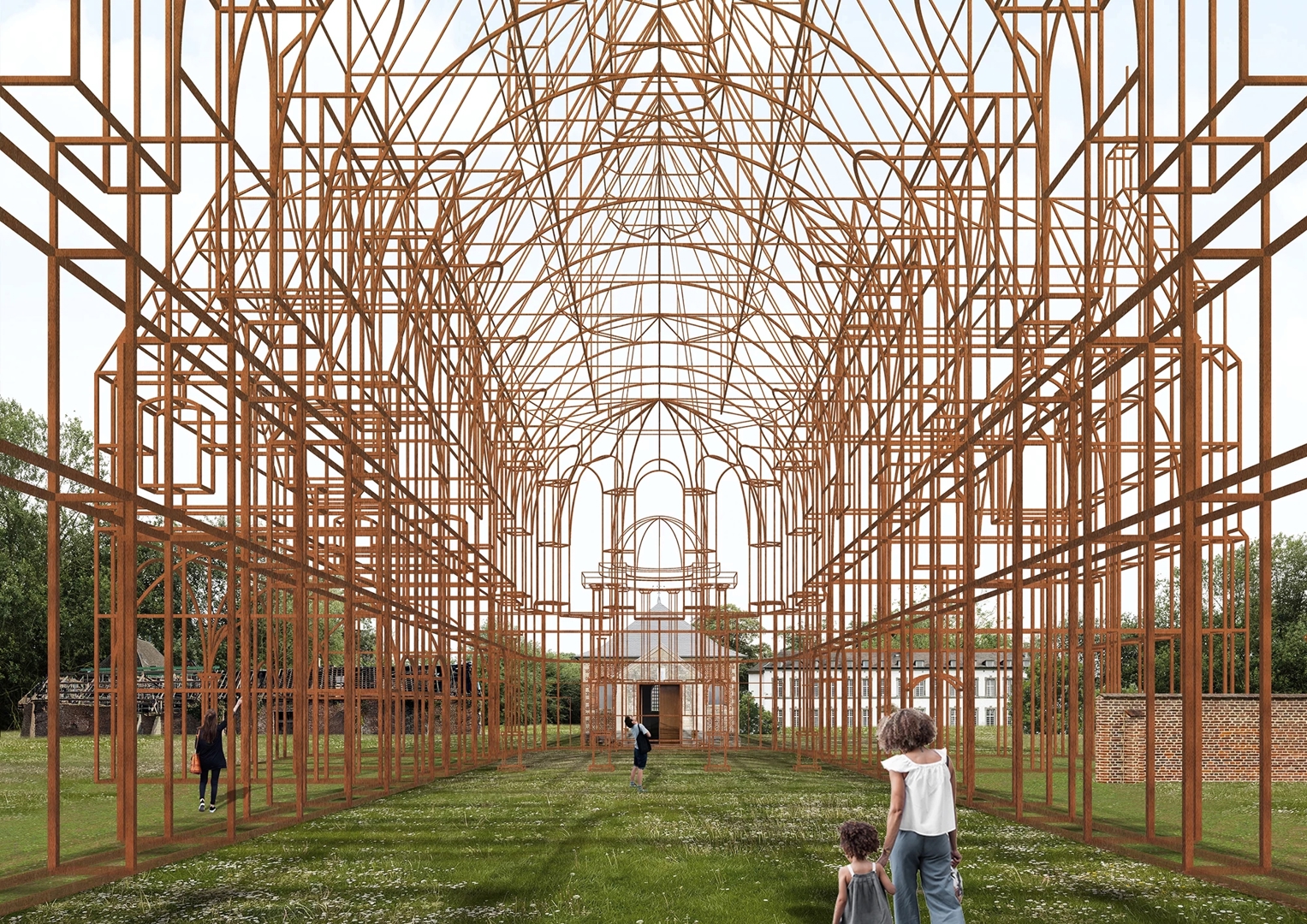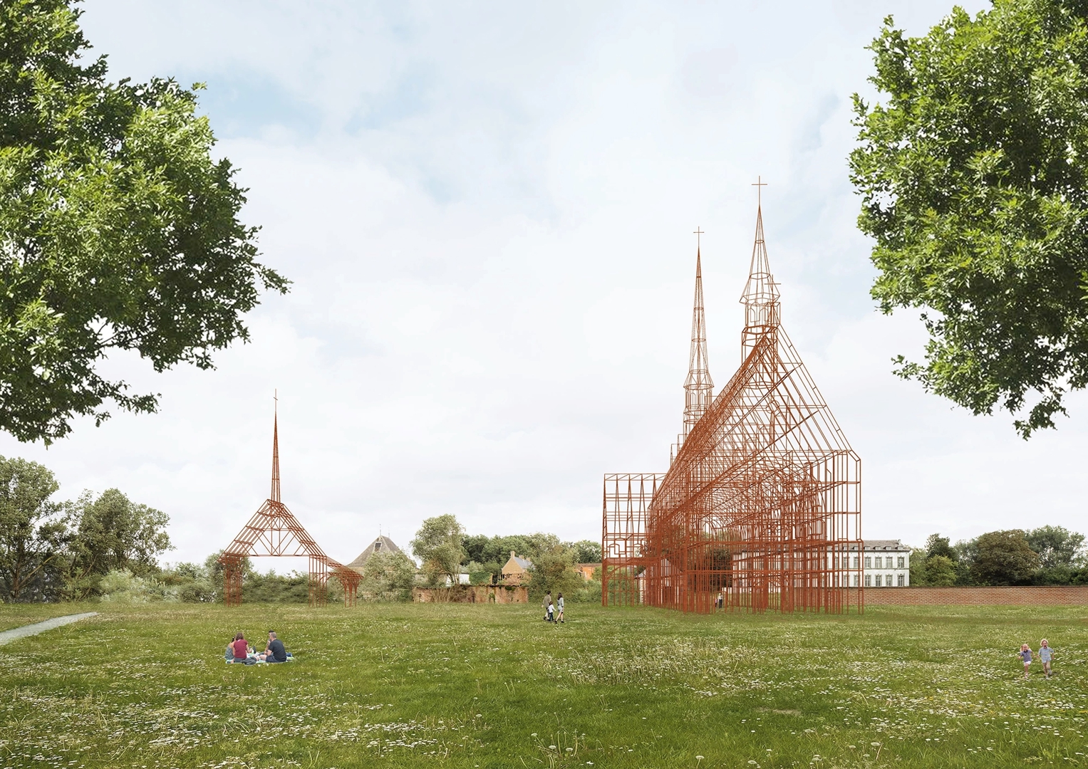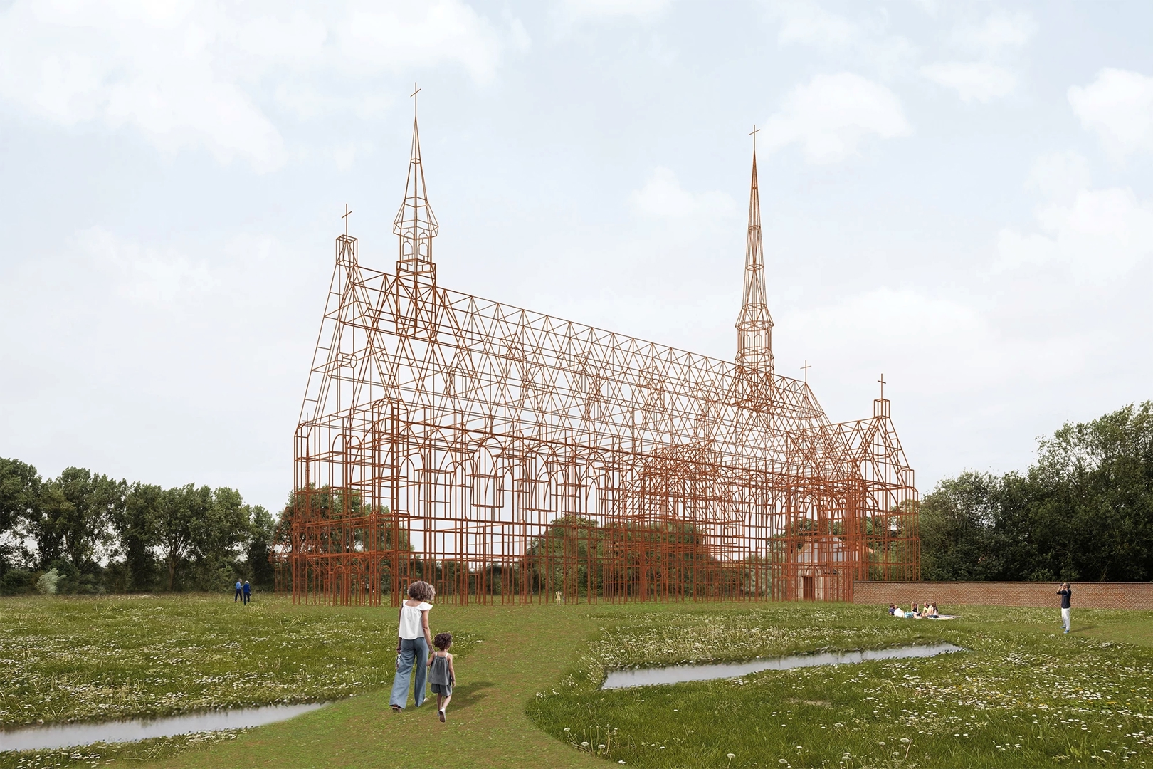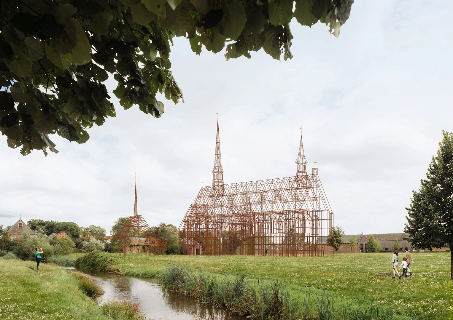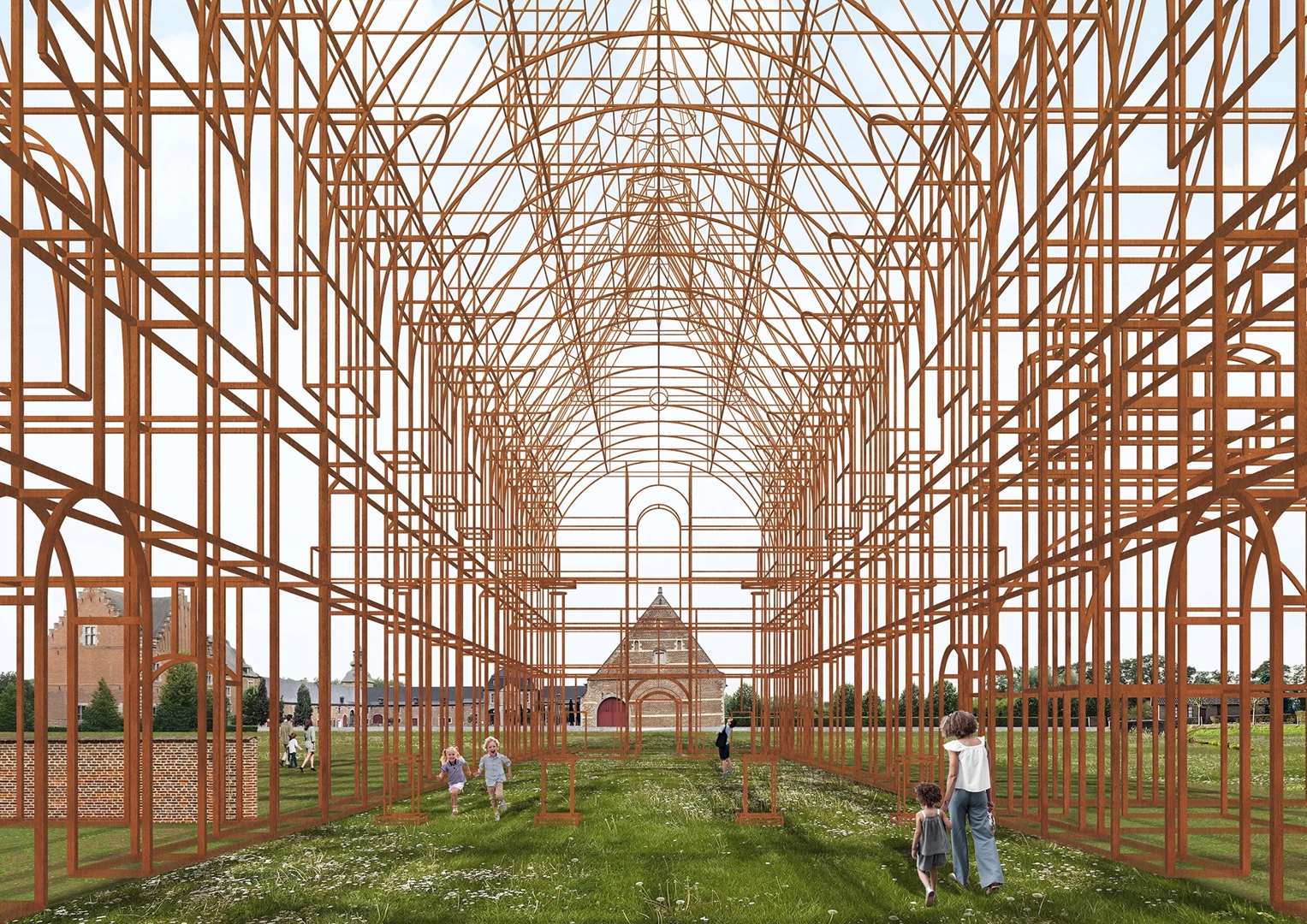 Het concept van Gijs Van Vaerenbergh geeft die ambitie een krachtige artistieke vorm. Door de verdwenen gebouwen van de abdij in een transparant stalen wireframe terug te brengen, krijgt de bezoeker opnieuw grip op wat ooit het spirituele en logistieke hart van de site was. Iconische vormen zoals ramen, gewelven en torens worden subtiel gesuggereerd, soms helder leesbaar, soms vervagend in het landschap. Het is een spel tussen herinnering en abstractie dat uitnodigt tot traag kijken.