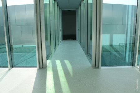 Samen met de witte muren en plafonds creëert de witte betonnen vloer het effect van één grote ruimte. Toch wilden de bouwheer en Stéphane Beel Architecten voldoende expressie in de vloer leggen. Door het gepolijste wit beton moest nog een zweem van het brute materiaal schemeren.