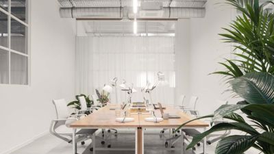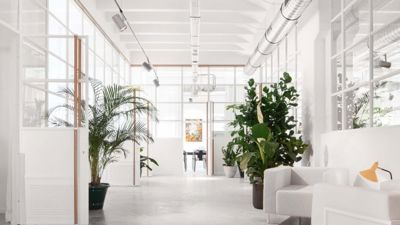 Binnen in het gebouw is de meest in het oog springende ruimte de hippe coworkingspace van Fosbury & Sons, die de eerste en tweede verdieping inneemt. KRAS architecten werkte de interieurvormgeving uit in samenwerking met Going East, dat niet aan zijn proefstuk toe was. “We hebben de stevige betonkolomstructuur van het voormalige opslaggebouw en de hoge plafonds in betonnen TT-liggers bewust in het zicht gelaten. De coworkingspace is geraffineerd opgedeeld in afzonderlijk verhuurbare kantoorruimtes met gedeelde vergader- en ontspanningsfaciliteiten. De scheidingswanden – in de vorm van slanke witgelakte stalen frames op een borstwering in baksteen – zijn onderaan ingevuld met een laag gehamerd glas en bovenaan met transparant glas. De inrichting laat zich omschrijven als fris wit met warme accenten, gecombineerd met specifieke hedendaagse kunstinstallaties die de gezelligheid van ‘samen werken’ stijlvol benadrukken. Dit alles resulteert in een aangename, huiselijke setting.”