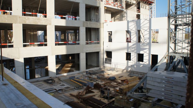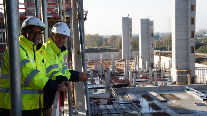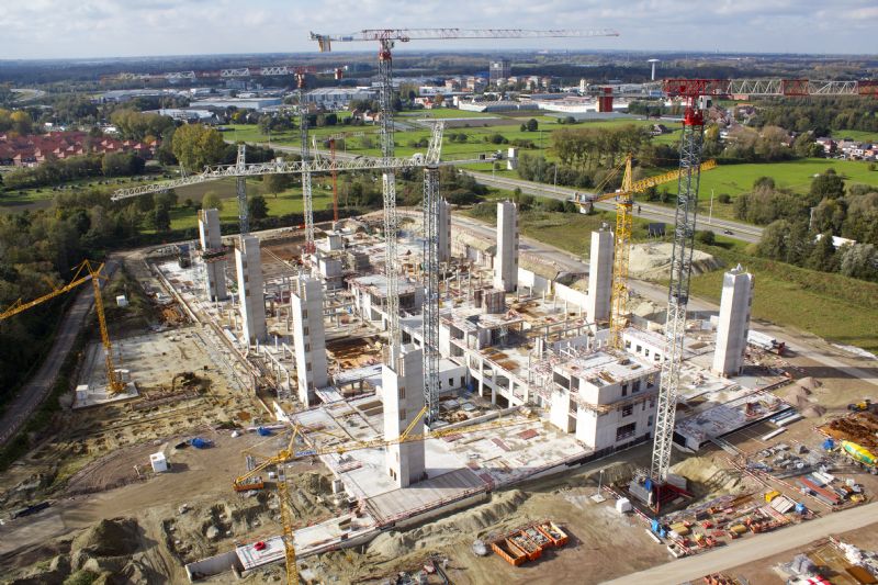 Het werk van MBG zit er voor bijna een derde op. De ruwbouwwerken zijn gestart in oktober 2013 en zijn volgens planning in 2016 klaar. De totale vloeroppervlakte bedraagt 105.000 m², verdeeld over 7 verdiepingen van ongeveer 200 bij 100 meter. “De uitvoeringstermijn lijkt makkelijk realiseerbaar, maar dat is het zeker niet”, zegt Van den Plas. “Aangezien de binnenafwerking al start in september 2015, moeten we tegen die datum al een deel van de ruwbouw wind- en waterdicht hebben afgeleverd. Het is dus een straks schema, we zijn er vanaf dag één ingevlogen.”