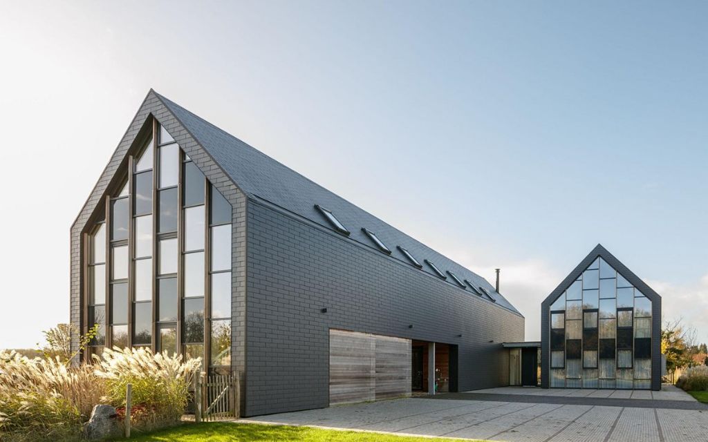 Op een uitgestrekt perceel aan de rand van het Zeeuwse dorpje 's-Heer Hendrikskinderen, een kleine deelgemeente van Goes (Nederland), geeft een rijzige ‘woning met schuur’ de landelijke omgeving extra cachet. Hoewel ze met haar karakteristieke zadeldaktypologie duidelijk aansluiting zoekt bij de woningen en boerderijen in de nabije omgeving, springt ze toch uit de band. Dit is vooral te danken aan de fraaie combinatie van beglaasde kopgevels en strakke langsgevels, die integraal bekleed zijn met leisteengrijze New Stonit leien.
