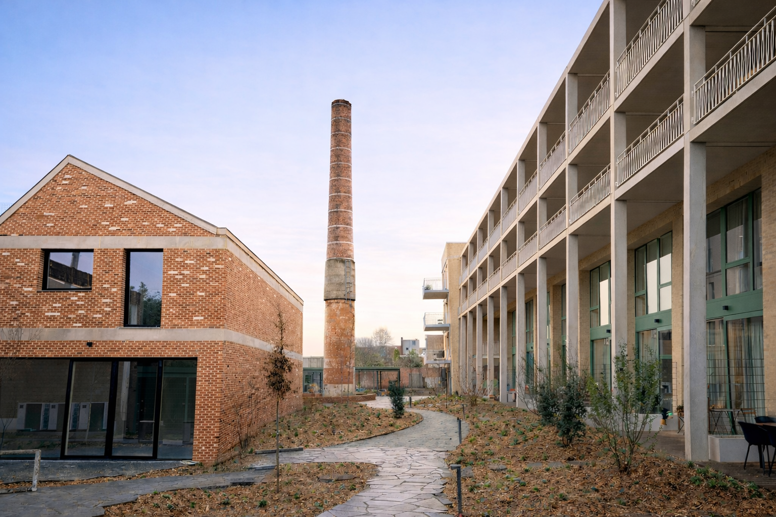 Stramien vertrekt in De Wastuin van een gelaagde ontwerpstrategie waarin sloop, behoud en nieuwbouw zorgvuldig op elkaar zijn afgestemd. Het industriële verleden van de site blijft leesbaar, onder meer via het behoud van de bakstenen schouw en de herbestemming van voormalige magazijnen, terwijl nieuwe volumes aan de straatzijde zich inschrijven in het fijnmazige stedelijke weefsel van Oud-Berchem. Die combinatie resulteert in een architectuur die ingetogen is, maar tegelijk duidelijk aanwezig, en die het verleden niet uitwist maar herinterpreteert.