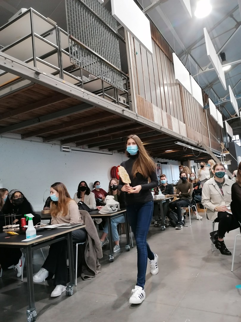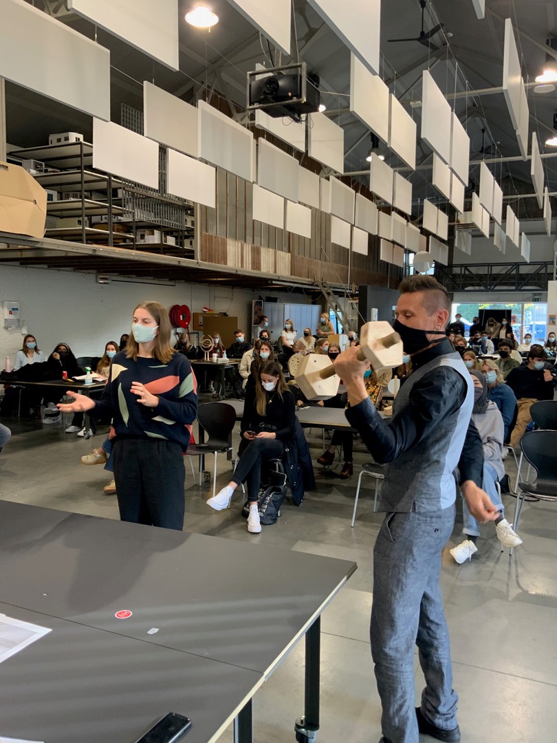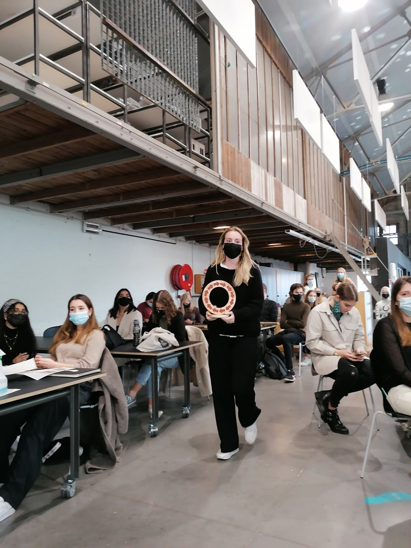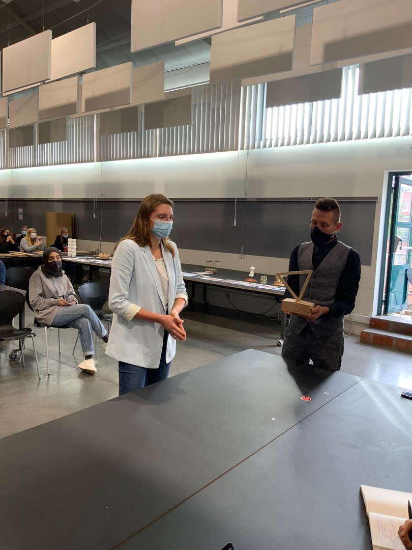 - Ilias Van Hoof: ook deze naamloze award werd op papier voorgesteld. Het ontwerp stond immers nog bij Van Hoof thuis en die kon zelf niet aanwezig zijn omdat hij genietend van een topsportstatuut aan het snowboarden was in het buitenland. De award bestaat uit staal – een circulair materiaal in de zin van letterlijke duurzaamheid; staal gaat enorm lang mee – en hout: twaalf stalen plaatjes gemaakt uit overschotten uit het werkhuis van de hogeschool zijn in een sokkel geschoven. Elke winnaar kan zijn gepersonaliseerde plaatje er dus gemakkelijk en zonder hulpmiddelen uit halen om het voor eeuwig bij te houden. Hij krijgt er ook een houten blokje bij om het plaatje in te plaatsen. Elk stalen plaatje heeft een cirkelvormige opening die verwijst naar circulariteit.