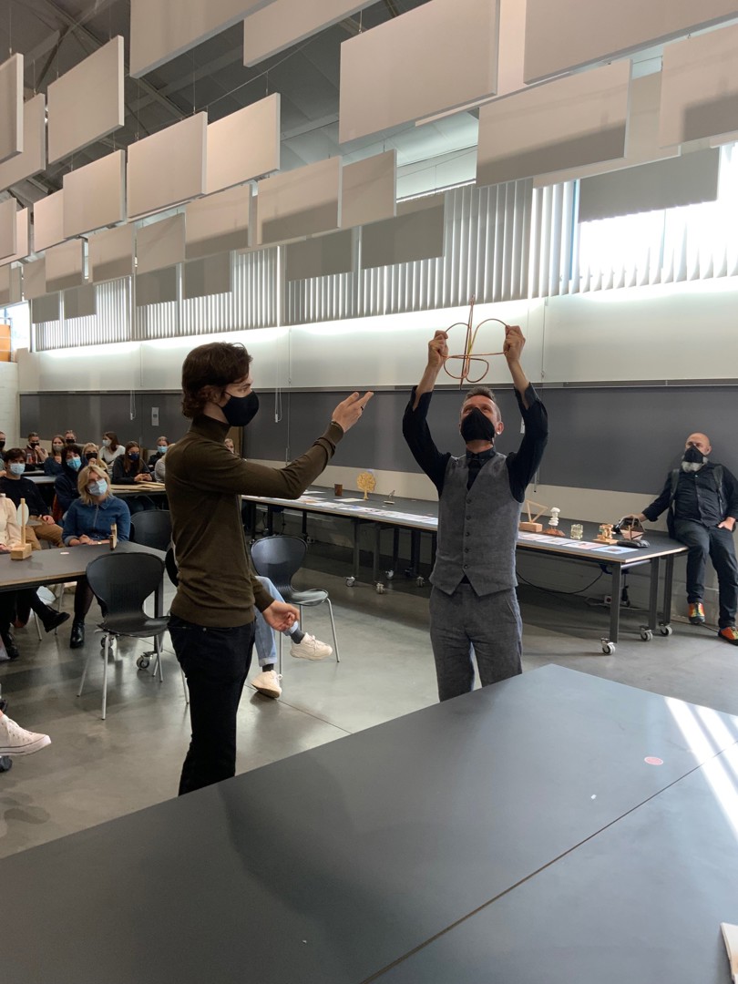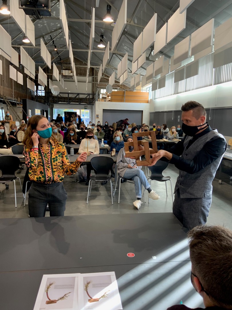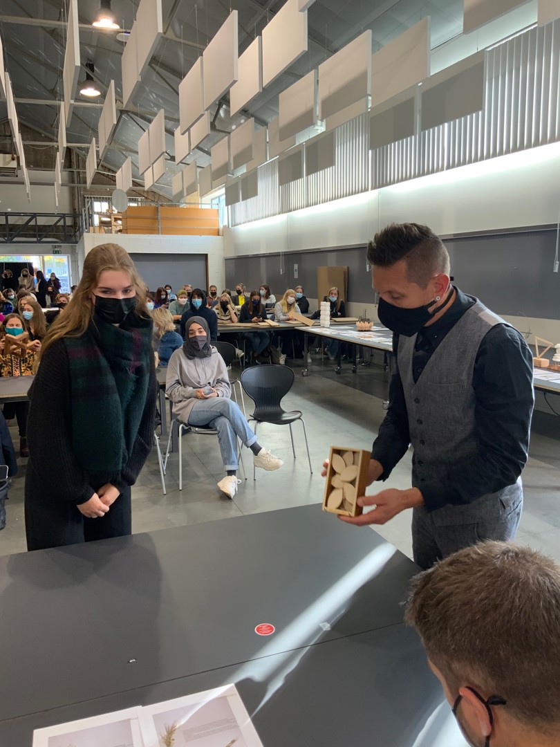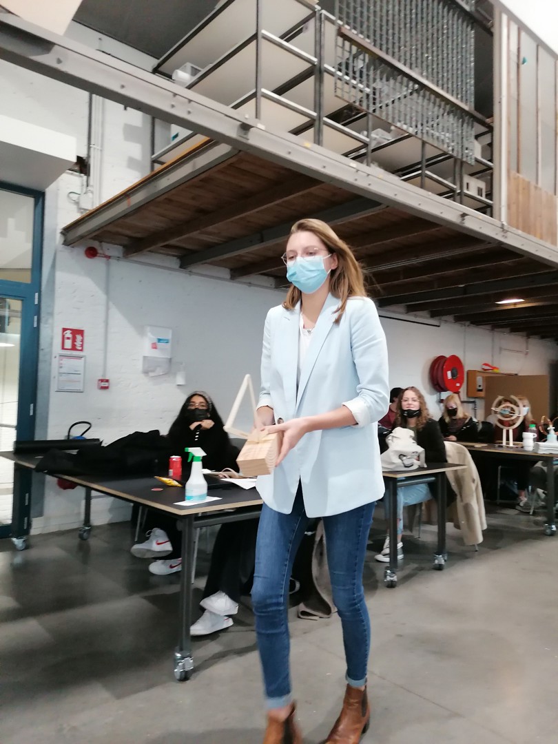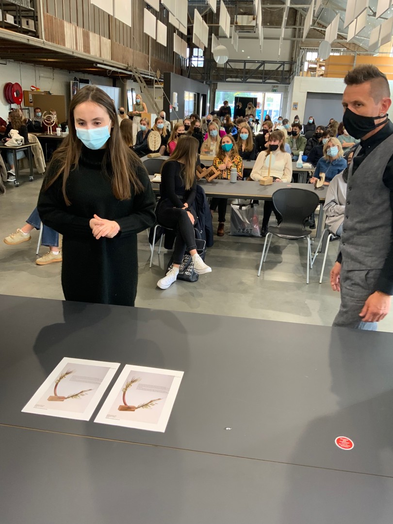- Yasmine El Jilali: de ‘CircuKrans’ bestaat uit een koperen buisje en gedroogde bloemen. Koper is een materiaal dat verschillende keren kan worden hergebruikt en de vorm van het buisje refereert aan het circulaire model. Met de gedroogde bloemen was CircuKrans van alle awards die Neven en ondergetekende te zien kregen de enige met een fysieke en niet verbeeldende link naar de natuur. “Omdat circulair bouwen draait om het verkleinen van de negatieve impact op de natuur”, legde El Jilali uit. Van deze award zullen twaalf exemplaren worden gemaakt. Elke winnaar mag de award dus houden in zijn geheel. Spijtig detail: het prototype dat El Jilali ontwierp werd enkele dagen voordat ze hem moest voorstellen ontvreemd uit het lokaal waar ze hem had achtergelaten en ze kon hem dus enkel op papier presenteren;