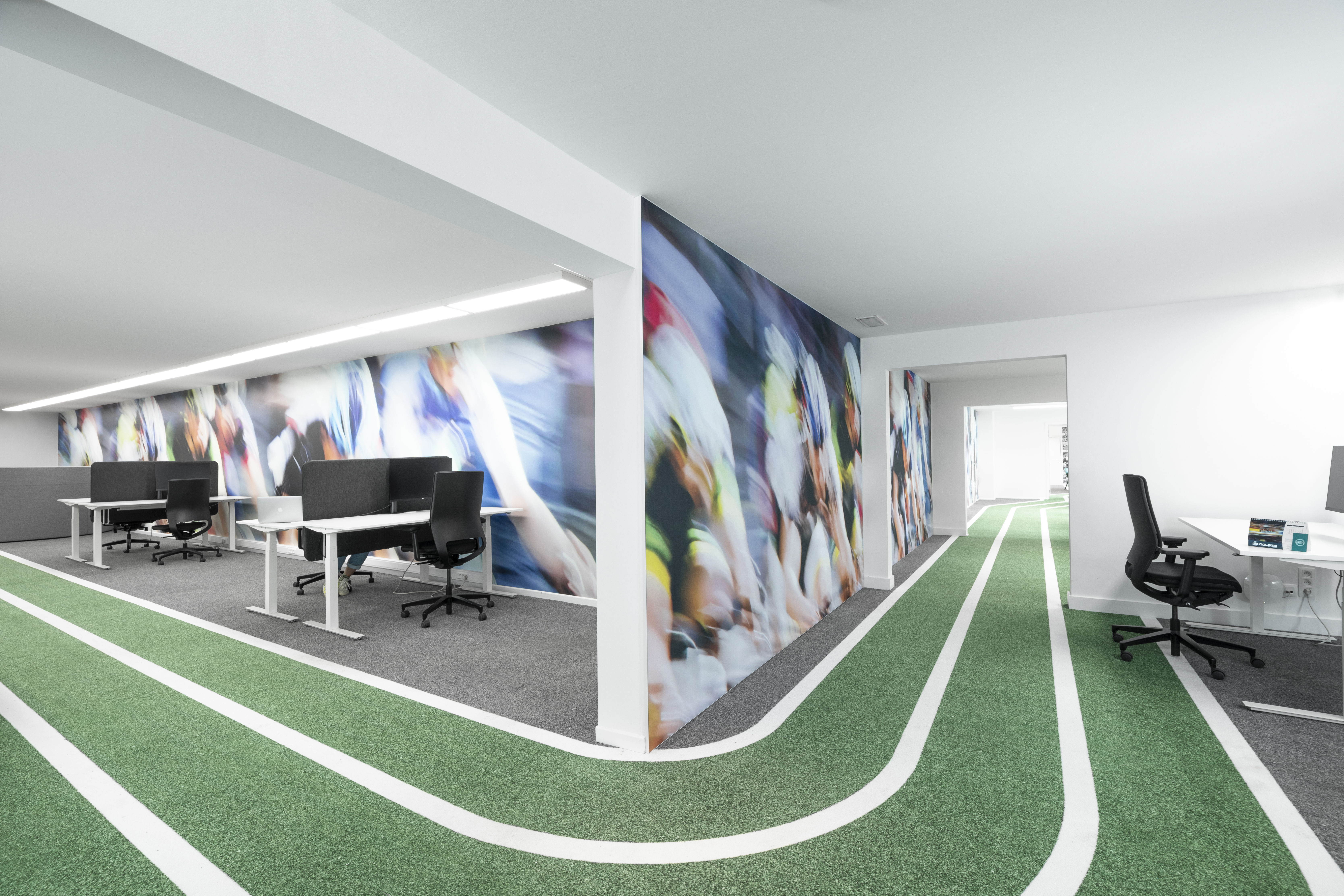 Om het idee van de looppiste tot uitvoering te brengen ging Studio Meraki op zoek naar een goede partner. PXL Carpets is gespecialiseerd in het bedrukken van tapijt en zij hebben onze wensen perfect vervuld. Het tapijt wordt bedrukt in stroken met een breedte van 2 m die achter elkaar worden gelegd. “Het was even spannend om de piste perfect te krijgen met de voorziene bochten vanaf de inkom tot mooi uitgelijnd op de muur in de vergaderzaal. Maar het resultaat is echt super”, besluit Studio Meraki.
