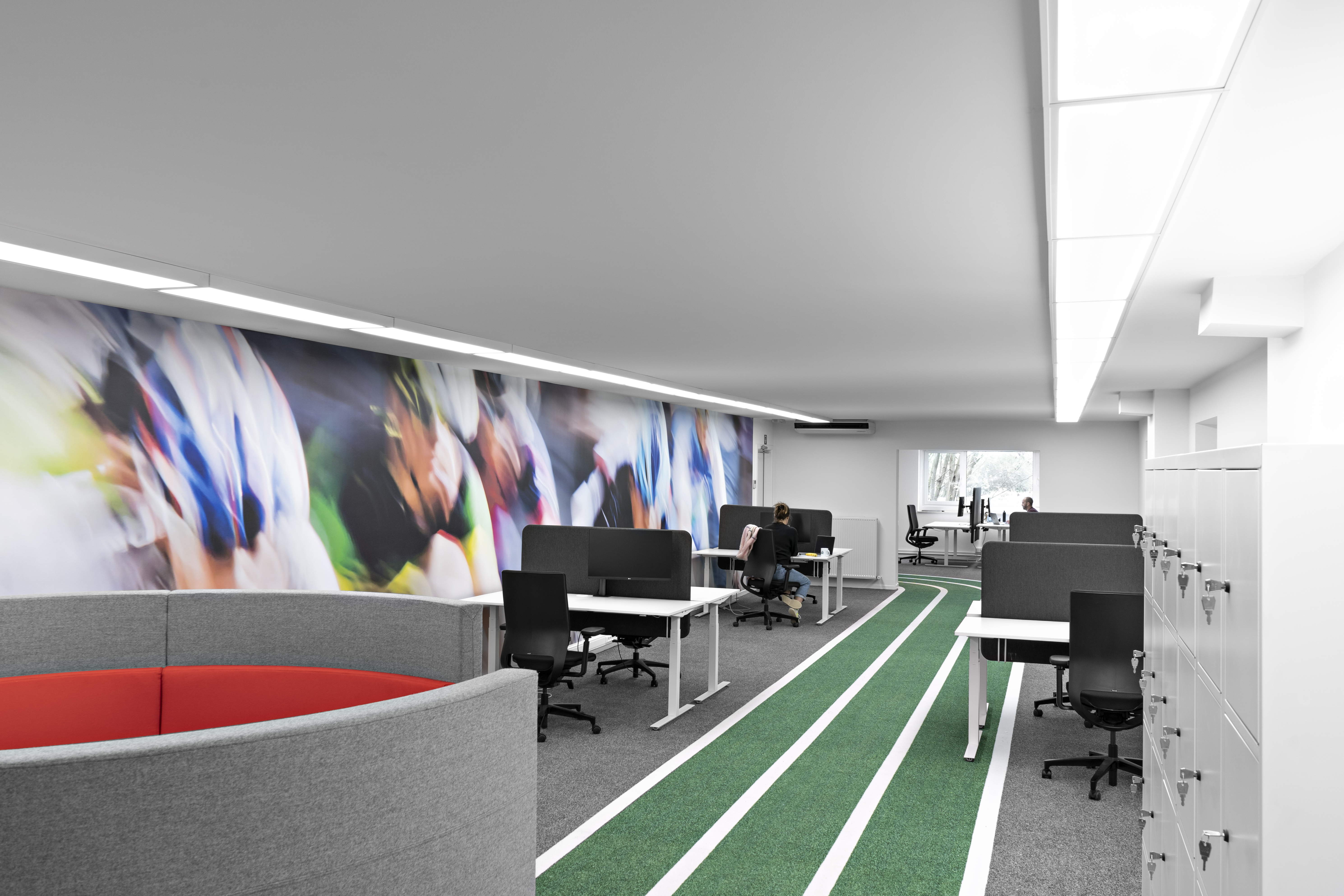 De belangrijkste eyecatcher in de vernieuwde kantoorruimte is het op maat gemaakte tapijt met groene looppiste die als rode draad doorheen de verschillende achter elkaar liggende ruimtes loopt, tot in de vergaderzaal. “Dit is natuurlijk een verwijzing naar de Memorial Van Damme, één van de vaandeldragers van Golazo”, klinkt het bij Studio Meraki. “Aan de inkom werden er lockers voorzien waar de eventmanagers hun persoonlijke spullen in kunnen opbergen. Deze doen wat denken aan de kleedkamers van een sportclub. Het originele vergadermeubel (de Ply van Drisag) in een ronde vorm, nodigt uit voor een efficiënte brainstormsessie of gezellig vergadermoment.”