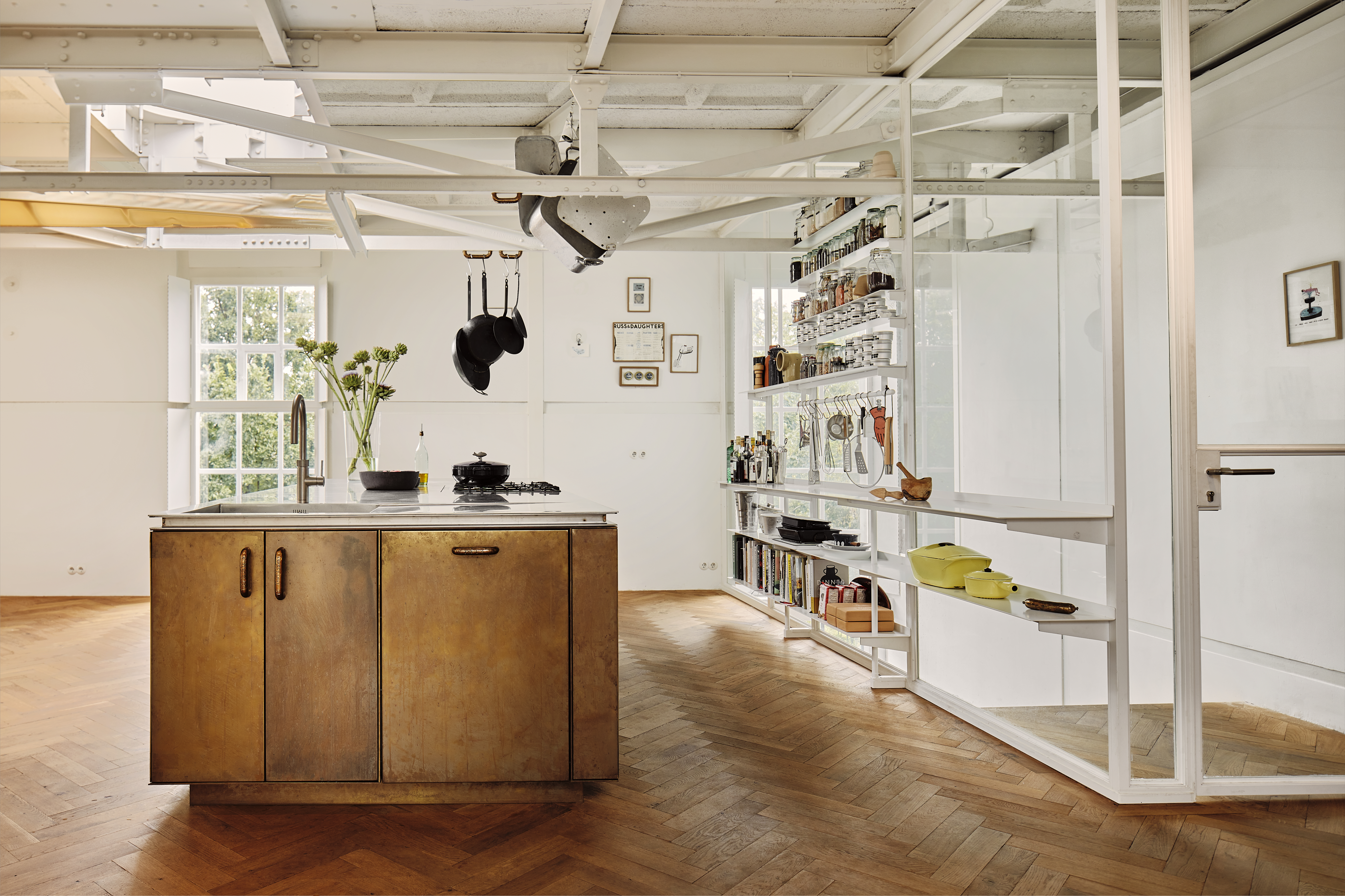 Versnaperingen voor bezoekers tijdens evenementen en presentaties in de galerij worden bereid in de open keuken van het woonhuis. Dankzij de transparante wand aan de achterzijde hebben gasten reeds vanaf de trap uitzicht op het kookvertrek en de witte leggers die ertegen leunen. Het opzichtige keukeneiland bestaat volledig uit messing, heeft een roestvrijstalen keukenblad en is langs alle kanten gevuld met kastjes. De op maat gemaakte bronzen handvatten en uittrekbare houten planken geven het geheel een elegante touch.
