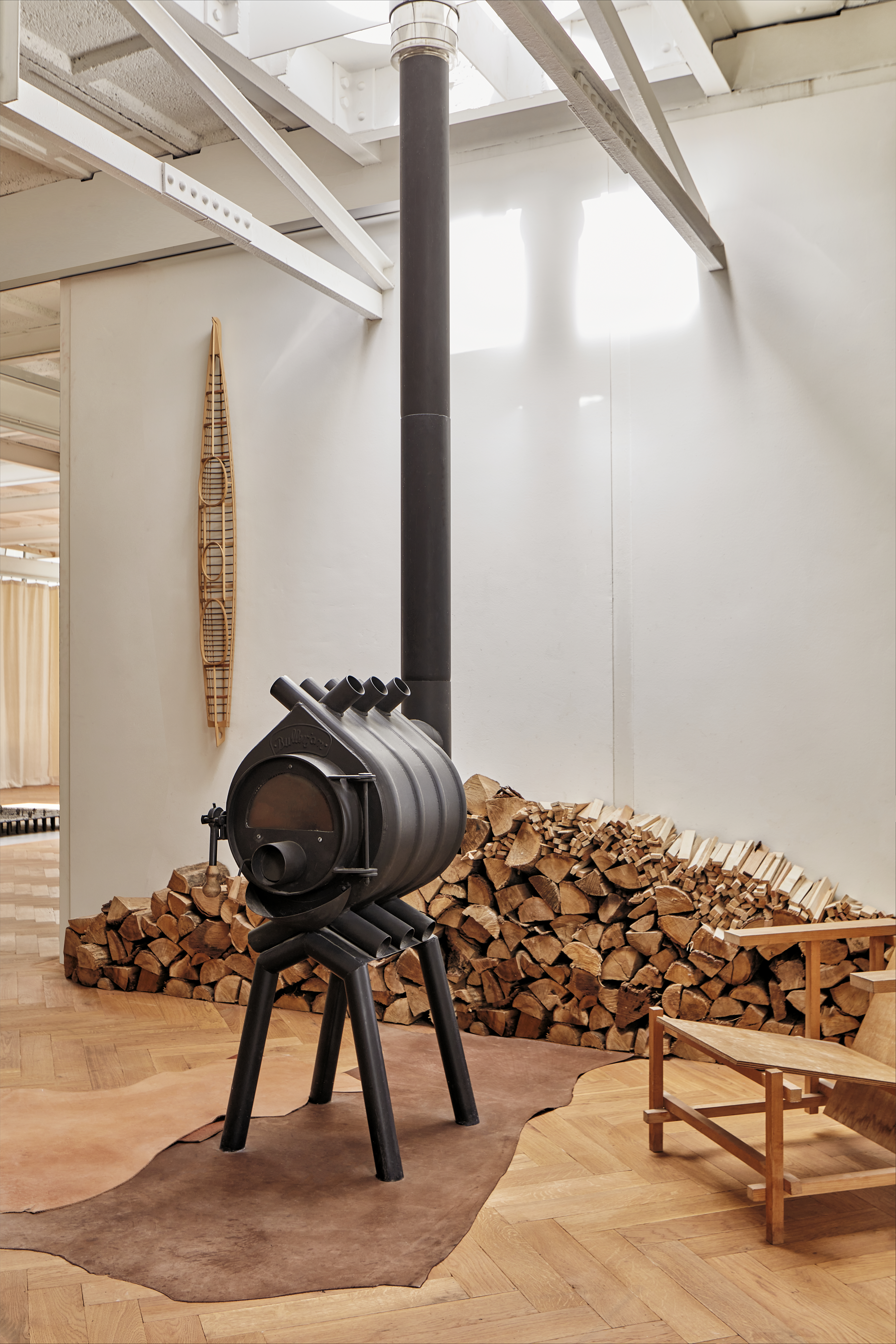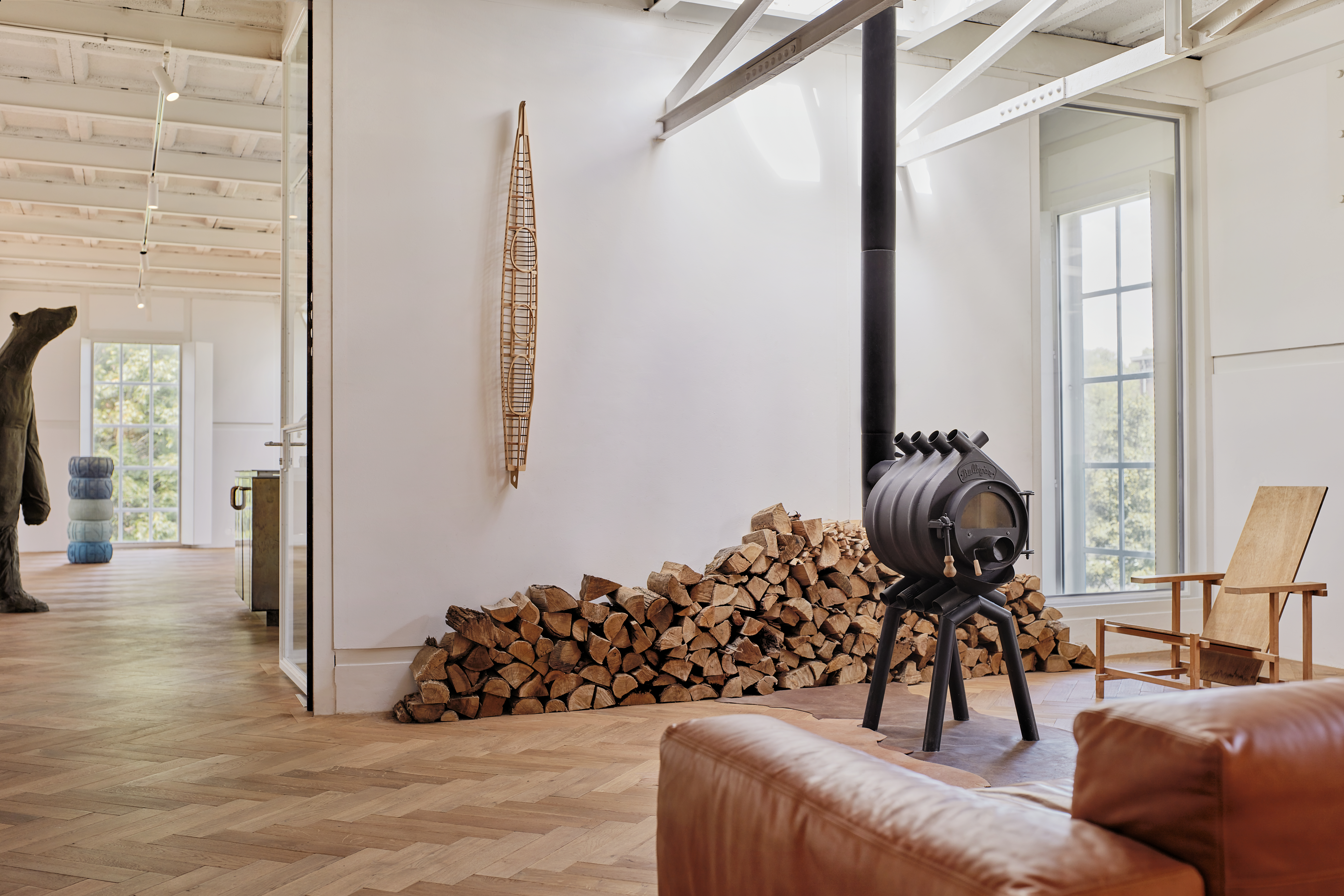 Een grote opening in de muur loodst bezoekers rechtstreeks naar de intiemere woonkamer. Dankzij de houten objecten, vintage meubels en de ouderwetse houtkachel krijgt de ruimte een instant warme sfeer.