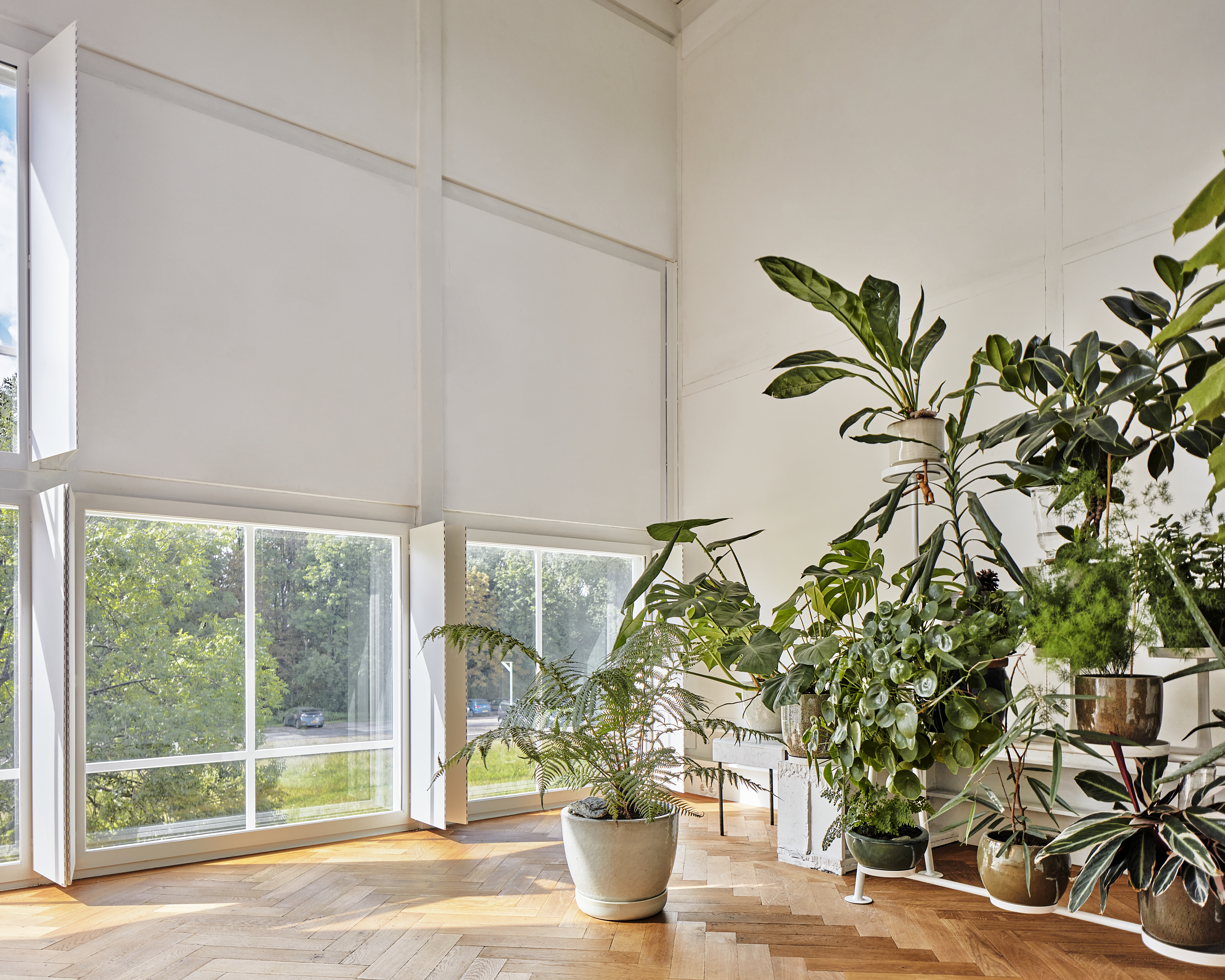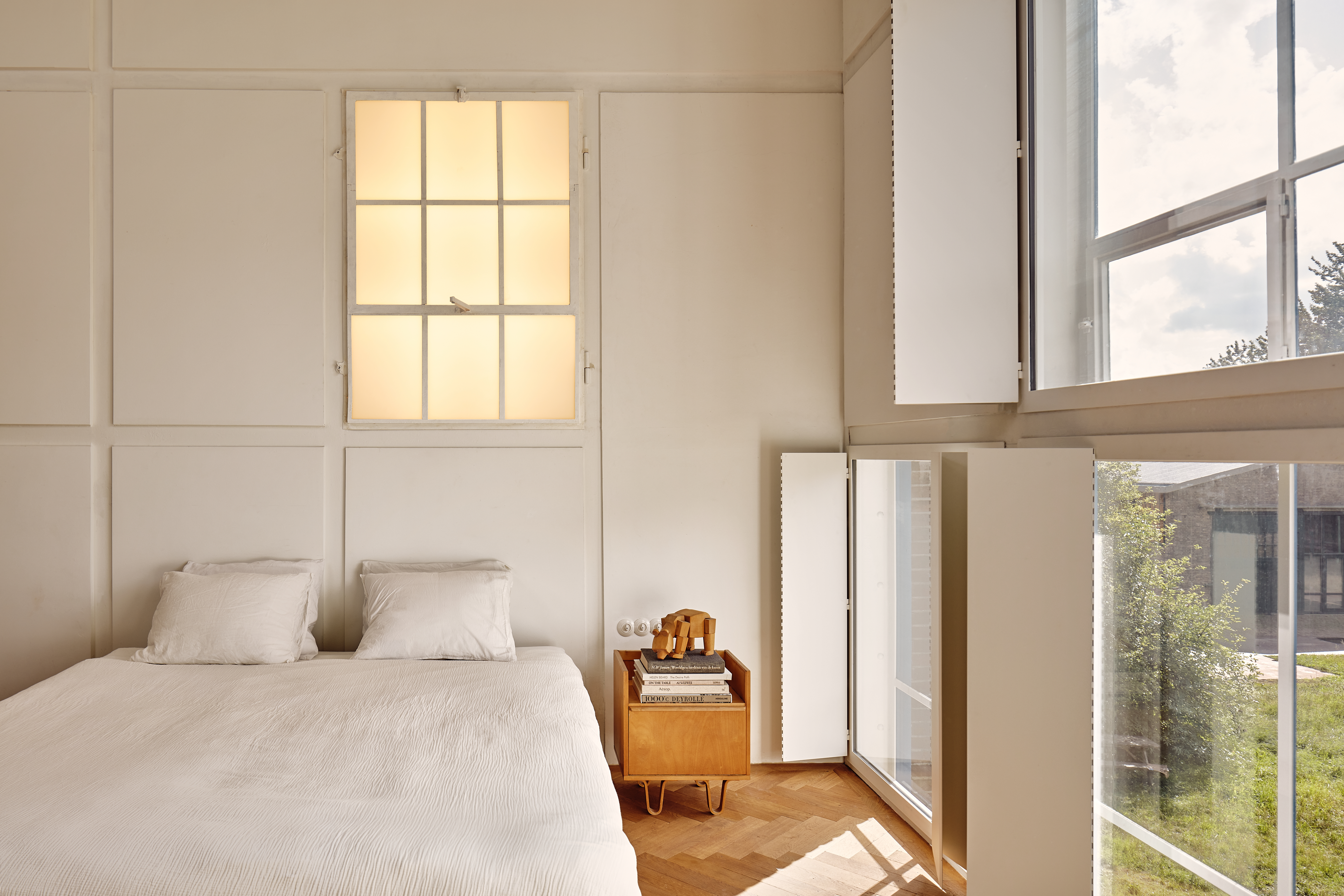 De oorspronkelijke ramen in de noordelijke muren van de huidige slaap-, bad- en woonkamer van het Ketelhuis vormde Studio Modijefsky om tot lichtbakken die warm licht deze kamers in sturen. Met de minimalistische witte luiken waarover iedere ruimte in het woonhuis beschikt, kunnen bewoners daarnaast de hoeveelheid inkomend licht makkelijk reguleren.