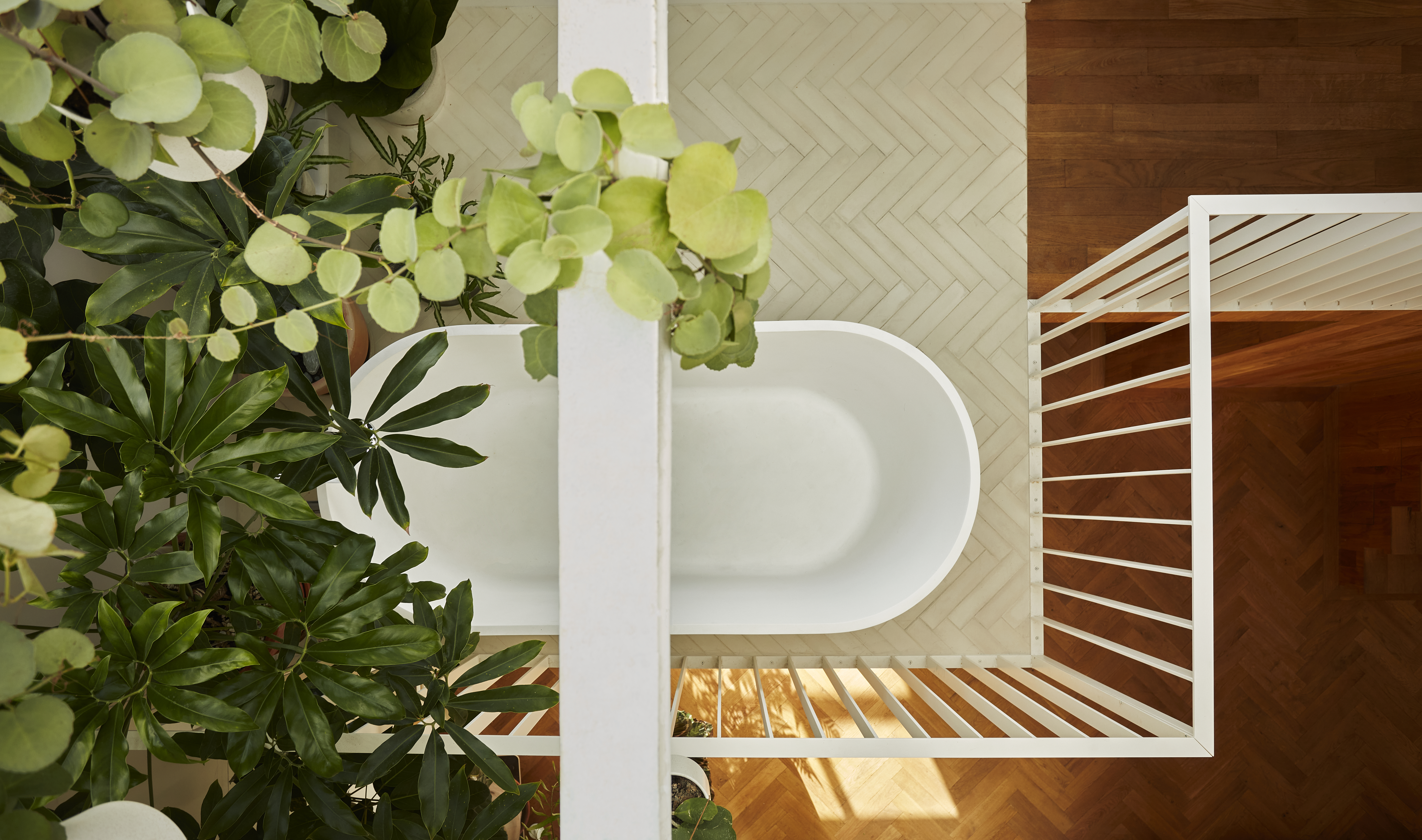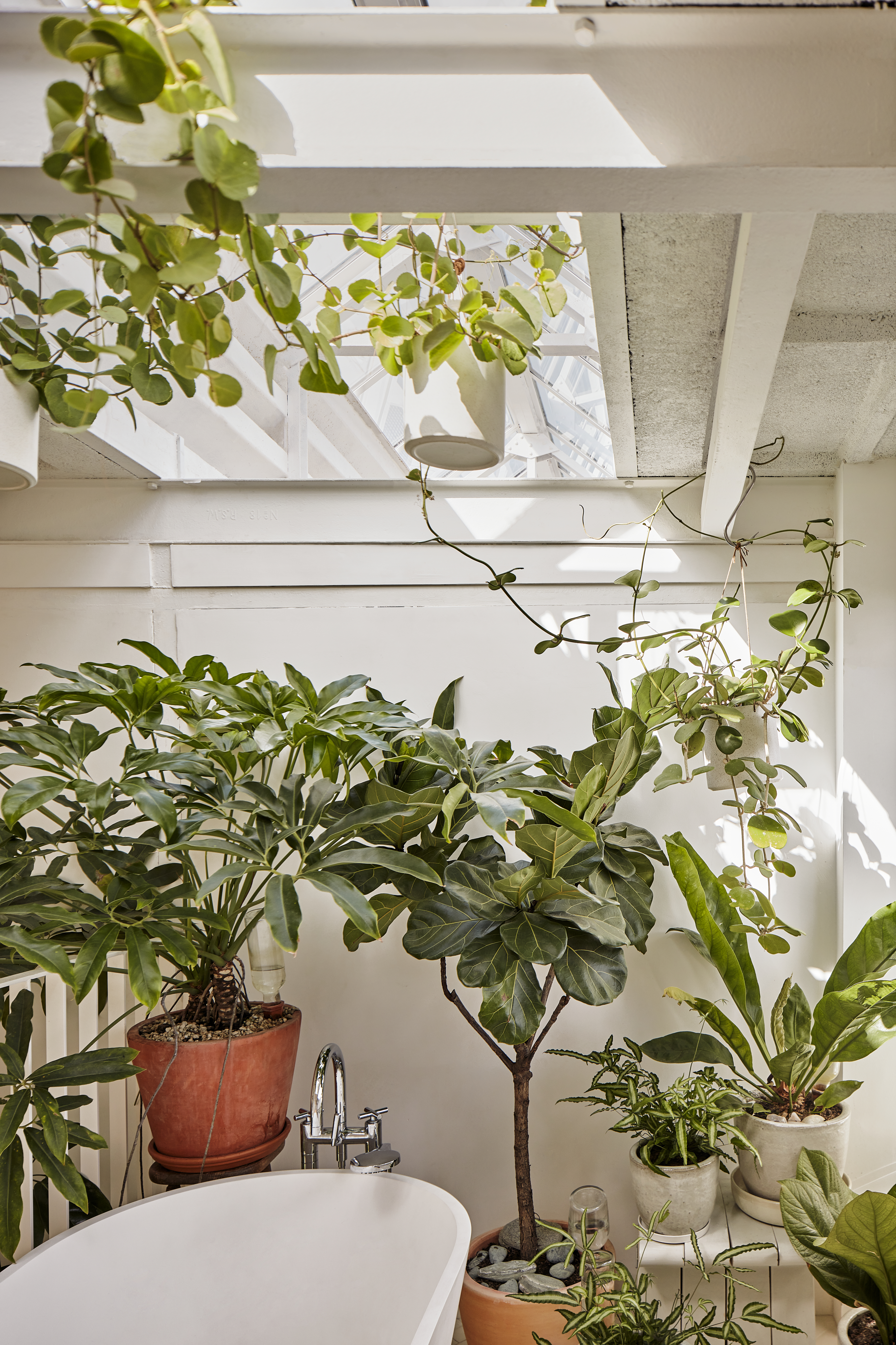 Aan het einde van de gang, ter hoogte van de master bedroom, verdubbelt de hoogte van het plafond zelfs. Dat hoogteverschil maakt het mogelijk om in de ruime slaapkamer een mezzanine te voorzien met een vrijstaande badkuip. De trapladder naar deze balkonachtige ruimte verstopt een houten kast met een simpel, maar gedetailleerd wit metalen traliewerk. De aanwezigheid van talrijke planten en een dakraam recht boven het bad - sterren kijken tijdens het badderen is mogelijk - verhogen de connectie met de natuur.