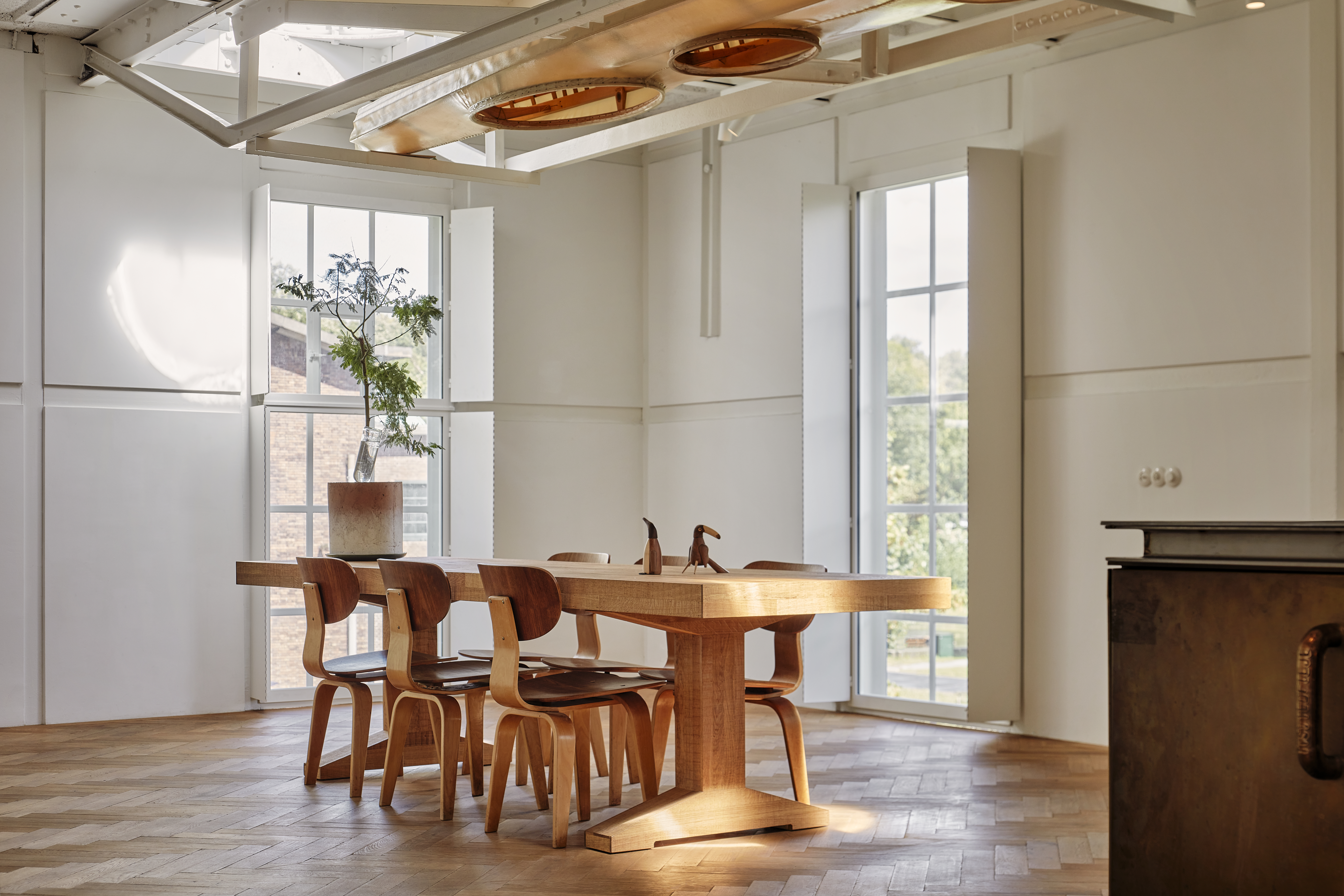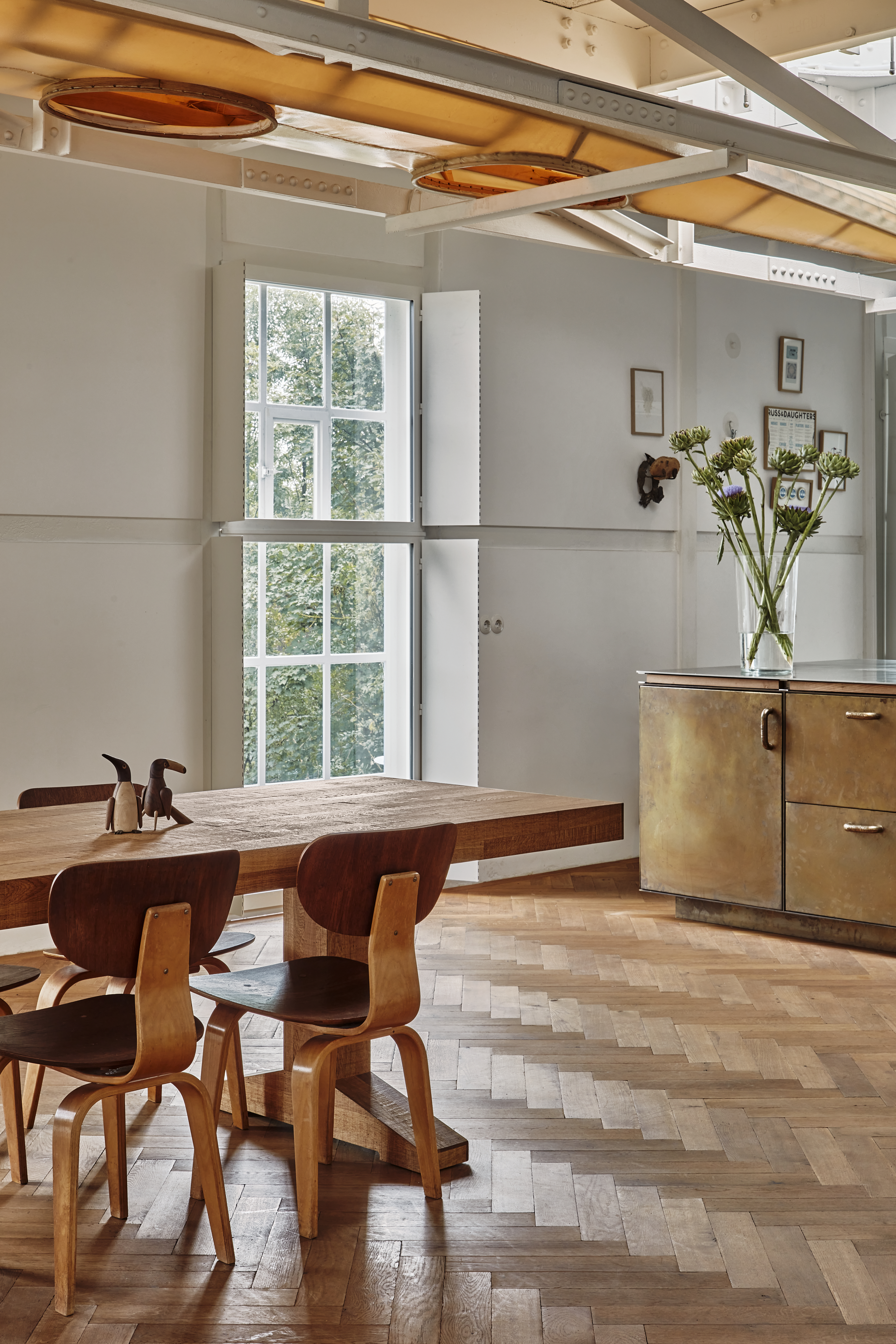 De open keuken loopt naadloos over in de - al even open - eetkamer. Een grote eikenhouten tafel en zes vintage stoelen zijn, op enkele decoraties na, de enige meubels in de kamer en houden op die manier het minimalistische design in stand. Toch zorgde Studio Modijefsky voor een artistieke blikvanger in de ingetogen ruimte: een zelfgemaakte kajak die dienstdoet als lamp en ondersteboven langs de volledige lengte van de tafel hangt.