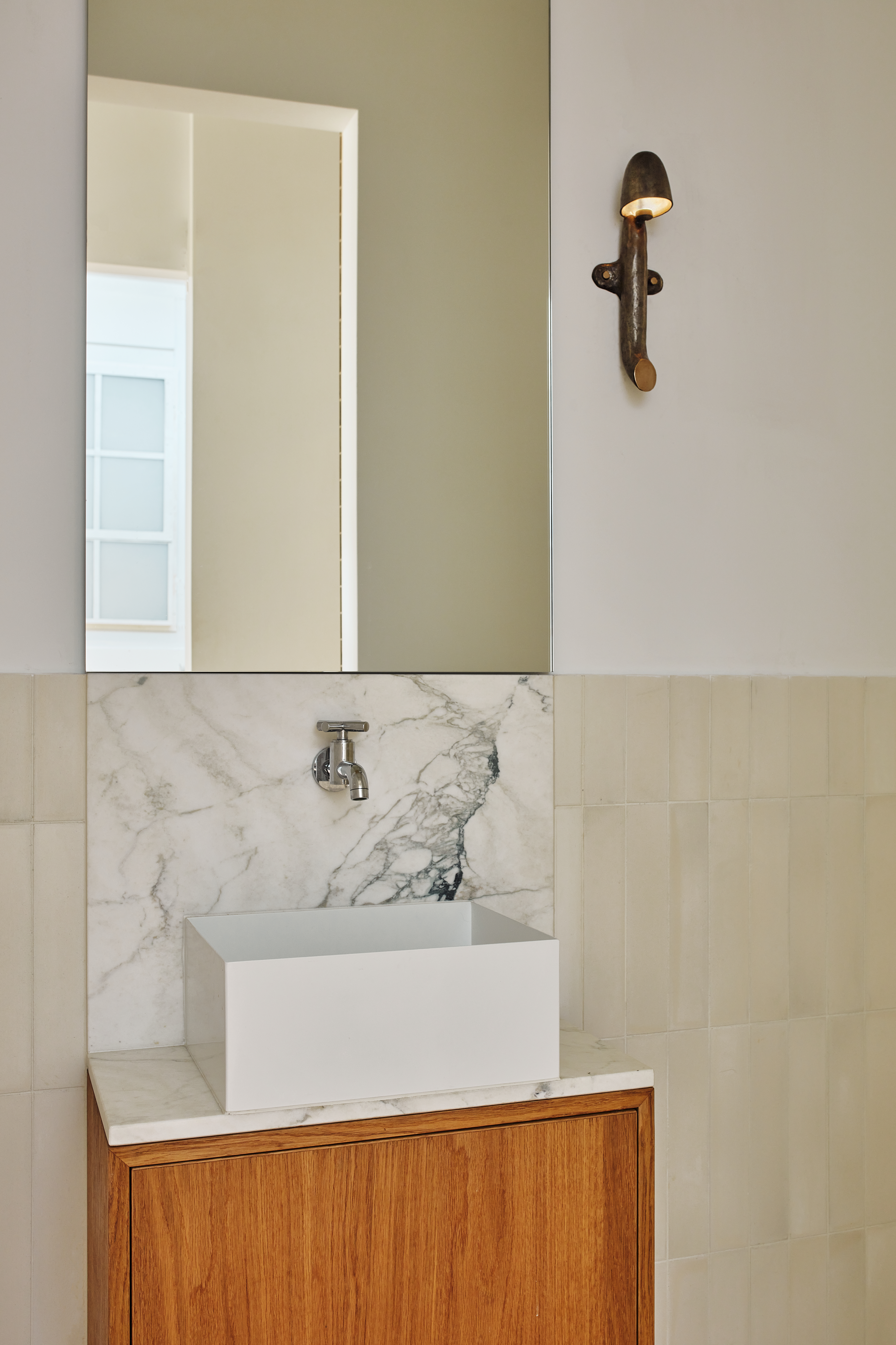 In de hal van het woonhuis camoufleren schuifdeuren naar de gastenkamer, inloopkast, badkamer en toiletten de muren. Witte vloertegels met visgraatmotief sieren de vloer van de twee laatste ruimtes. Die vloerbedekking correspondeert mooi met het eikenhout en witte marmer van de strakke badkamer- en toiletkastjes, terwijl de bronzen verlichtingsarmaturen, ontworpen en gemaakt door de eigenaars van het pand, net een leuk accent in de sanitaire ruimtes zijn. De hoge spiegels boven de wasbakken zorgen er dan weer voor dat het plafond in de badkamer en toiletten optisch vergroot.