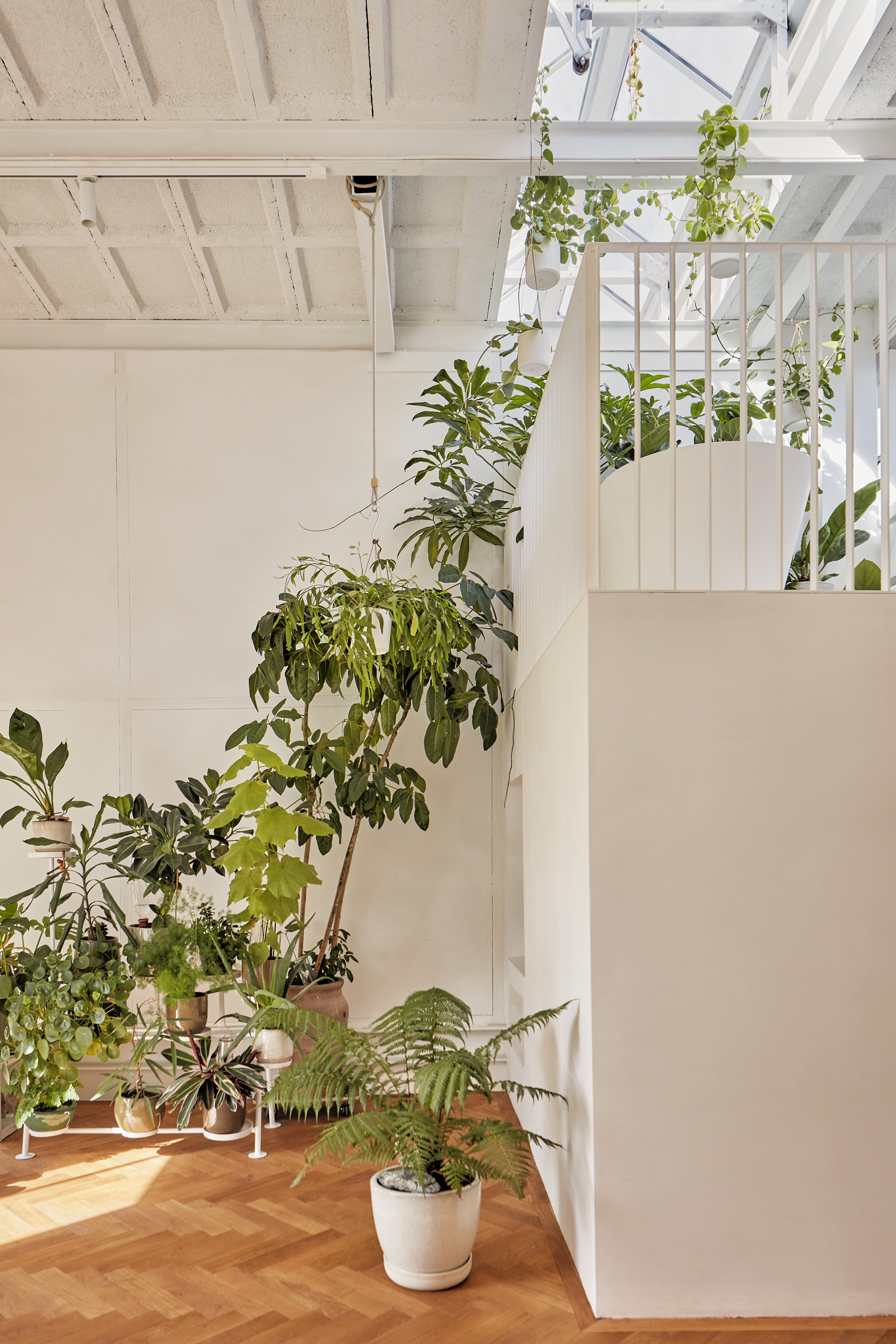 Waar het ontwerp van de benedenverdieping niet erg spectaculair is, springt het sobere interieur van de eerste verdieping met zijn overvloed aan wit geverfde materialen, eikenhout en messing net wél in het oog. De volledig witte muren op deze etage onthullen het oorspronkelijke industriële raamwerk en voegen daarmee reliëf toe aan de wanden.