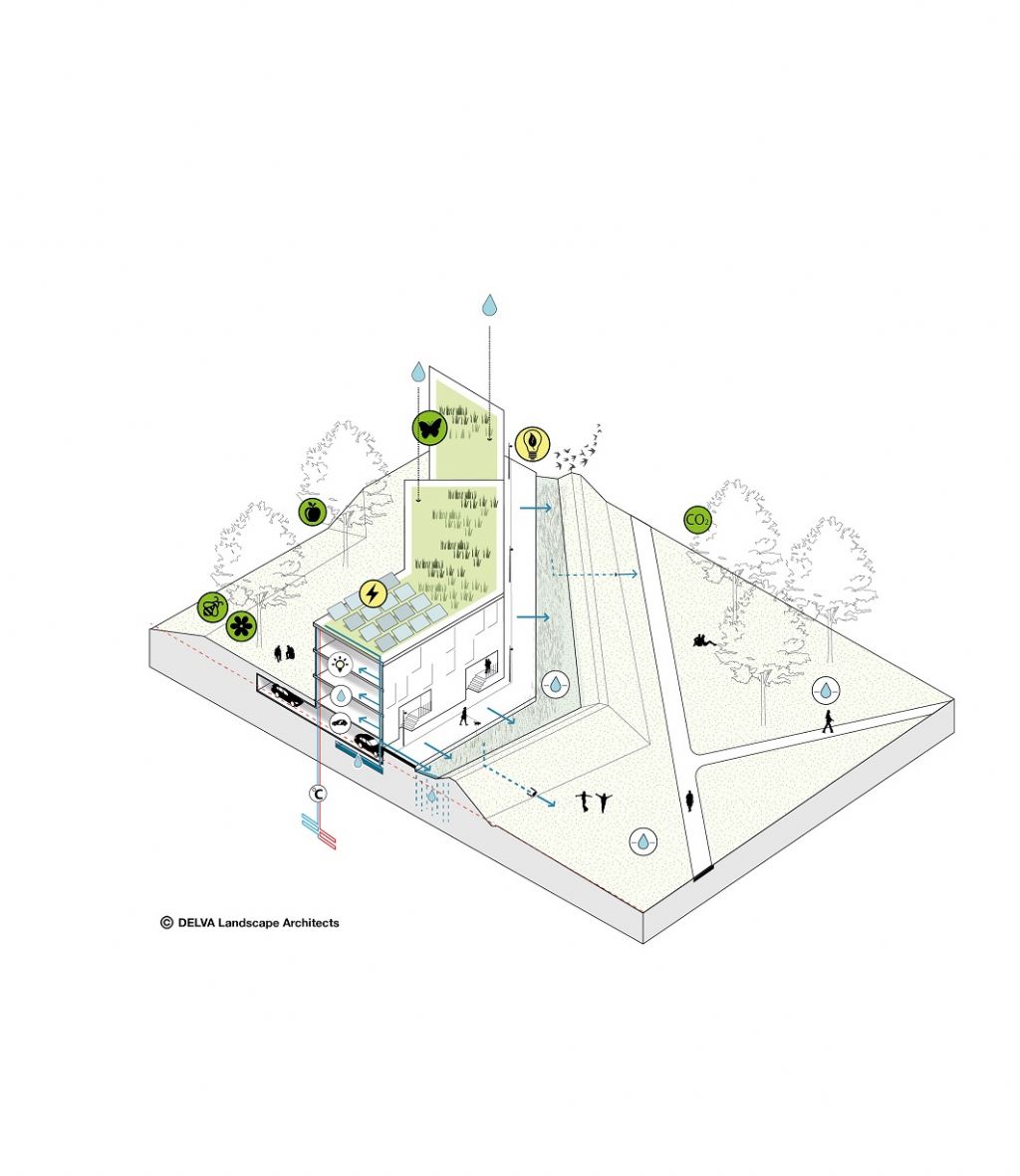 Door het doordacht positioneren van de dijken ontstaat de mogelijkheid om parkeren van auto’s te voorzien onder het maaiveld. “Daardoor kan een weelderige binnenwereld gecreëerd worden: een plek met diepe privétuinen die naadloos overlopen in een collectieve groene ruimte. De ruimte vormt de plek om buren te ontmoeten en samen in de collectieve moestuin te werken.”