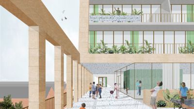 Het gebouw krijgt een geheel eigen identiteit, zowel in vorm als in materialisering. Een eigentijdse woon-ziggurat van buiten- en binnenruimtes ontwikkelt zich bovenop de publieke plint en geeft licht, zicht en ruimte aan de diverse bewoners. Vastberaden om een tijdloos gebouw te maken, kiest URA Yves Malysse Kiki Verbeeck resoluut voor een duurzaam materiaal. Het volledige gebouw wordt aan de buitenzijde opgetrokken uit natuursteen. De binnenzijde is een samenspel van baksteen, tegels en groen.