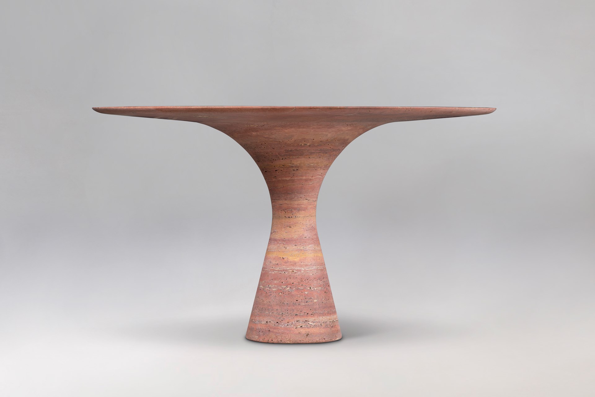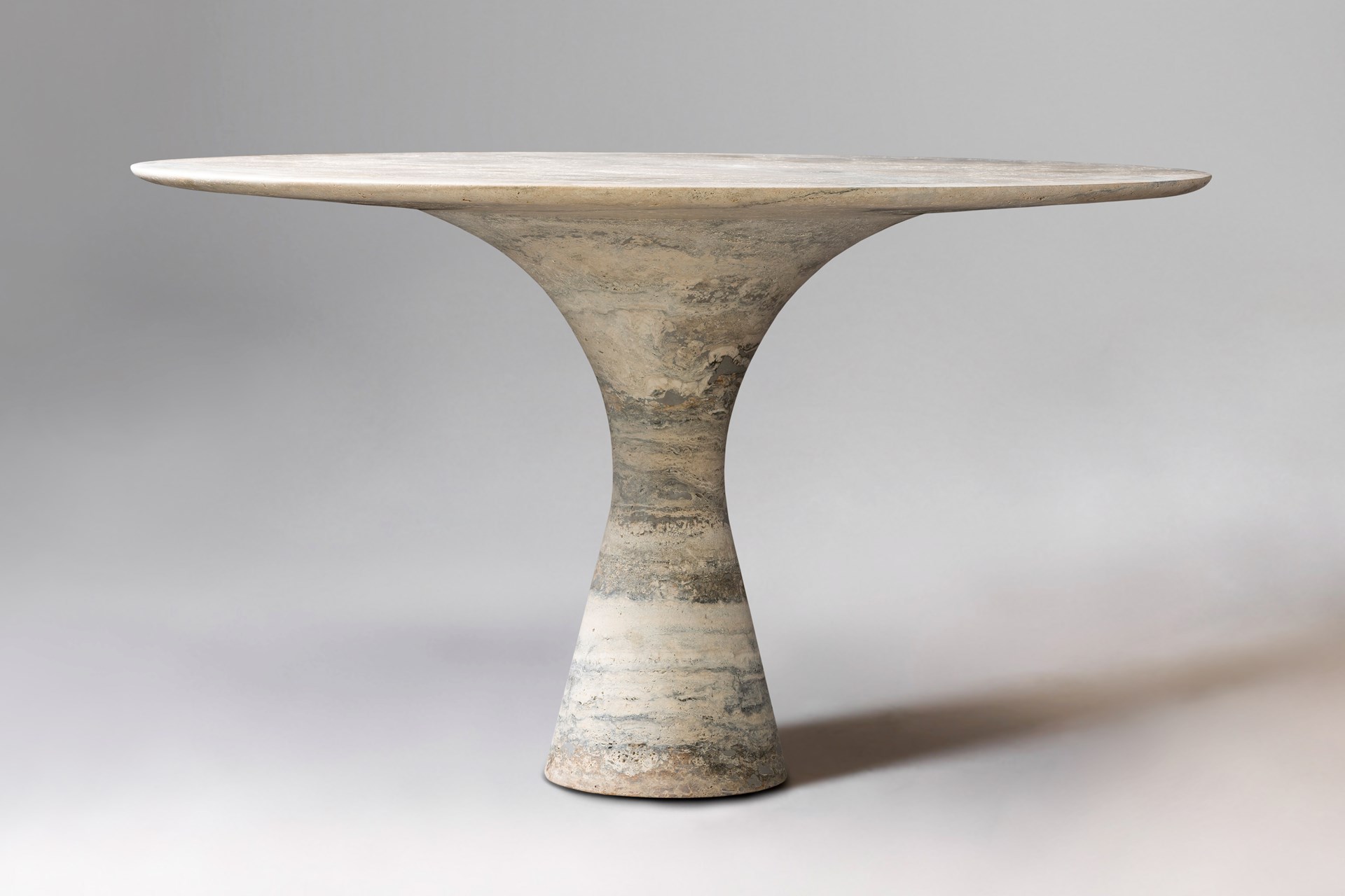Angelo M is de essentie van een ronde of ovale tafel in natuursteen. De twee elementen, voet en blad, vormen samen één geheel. De onderzijde is één vloeiende curve vanaf de voet tot de tafelbladrand. De conische verbinding tussen beide delen zorgt voor een stabiel geheel. De collectie bestaat uit eettafels, salon- en bijzettafels die één voor één met de hand worden afgewerkt. Het resultaat is een unieke tafelcollectie die de schoonheid van marmer weerspiegelt.