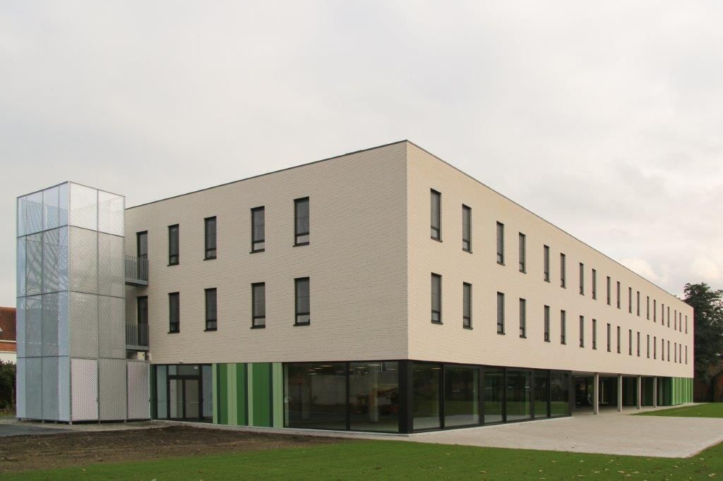 Het voorontwerp van het GO! was al klaar toen Archiles architecten in juni 2015 de opdracht kreeg om het uitvoeringsdossier verder uit te werken. “We hebben het in bepaalde opzichten verfijnd en hebben vooral de technische faciliteiten geoptimaliseerd. Zo hebben we onder meer het keukenblok, dat aansluit bij de refter, afgestemd op de specifieke noden en wensen van het keukenpersoneel. Voorts hebben we de werken opgevolgd en alle disciplines (stabiliteit, technieken, EPB, akoestiek) gecoördineerd”, vertelt Luk Segers, architect-zaakvoerder bij Archiles architecten. “Het was in de eerste plaats zaak om een heldere organisatie te creëren. De negentig kamers zijn ingericht aan de vier zijden van het gebouw en zijn verdeeld over twee vleugels en twee symmetrisch opgedeelde verdiepingen, zodat er leefgroepen van twintig à vijfentwintig kamers ontstonden. Deze kamers geven uit op twee centrale ontspanningsruimtes. Dit vermijdt al te lange gangen en bevordert de interactie tussen de bewoners. Om te verhinderen dat er in het uitgestrekte volume donkere ruimtes zouden ontstaan, hebben we midden in het gebouw een grote patio van 30 meter lang en 6 meter breed geïntegreerd. Dit zorgt ervoor dat er ook in de kern van het complex sprake is van natuurlijke lichtinval. Bovendien accentueert de patio de inkomzone op het gelijkvloers.”