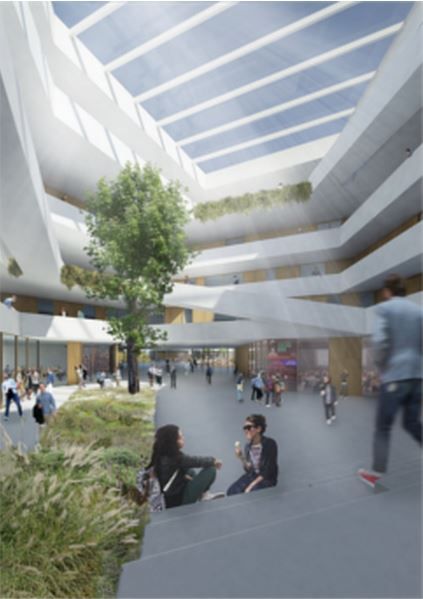 Vanuit het atrium heeft men direct zicht op de verdiepingen. Hier liggen de lokalen, labo’s en teamlokalen aan een eigen omloop. Via een spiraalvormige route van trappen bereikt met de verschillende verdiepingen. Transparante wanden dragen bij aan een levendige sfeer. Elke verdieping heeft een eigen koffiecorner gekoppeld aan een overdekt terras, waar men van het uitzicht over het park kan genieten.