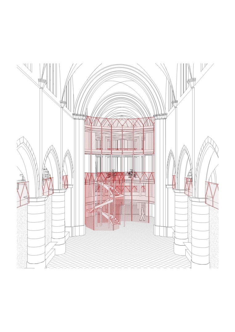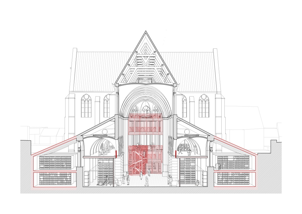 Het ontwerp van ectv architecten berust op vier uitgangspunten die nauw met elkaar verbonden zijn: ‘beter binnenkomen dan doorwaden’, ‘schoon schip’, ‘voorbij de viering’ en ‘gastvrijheid’. Door niet in te gaan op het initiële idee van het VAi om in het bouwblok een doorgang te voorzien, creëren de architecten plaats door de zijvleugels in de breedte uit te breiden. Door elders te ontharden vergroot de footprint van de kerk niet. Er ontstaat wel meer vloeroppervlakte voor de archiefwerking. Het grootste deel van de ontwerpopdracht bestaat immers uit het onderbrengen van de collectie van het VAi. “We waren van bij het begin terughoudend om in de hoogte te werken”, benadrukt architect Els Claessens. “Door te stapelen creëer je veel gewichtsmassa op één plek en dat leek ons gezien de onzekere staat van de fundamenten geen goed idee. Bovendien maak je hiermee het aanzicht van de kerk en haar constructie voor een groot stuk onzichtbaar.”
