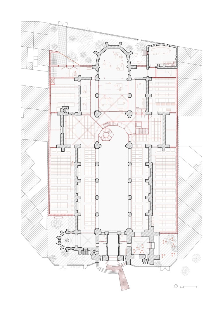 Door de zijdelingse uitbreiding blijft het schip als publieke ruimte vrij voor wisselend gebruik. Schoon schip maken dus. Tania Vandenbussche: “Het schip als centrale ruimte vrijhouden is de essentie van het ontwerp. Door een gemengd gebruik toe te laten, creëer je een plek voor ontmoeting.” Achter de monumentale ruimte van het schip worden nieuwe vloeren toegevoegd voor de dagelijkse werking van het VAi. Om de relatie tussen de bezoeker en het VAi zo transparant mogelijk te maken, werken de architecten met doorzichtige roosterwanden tussen het schip en de kantoren en verwerkingsruimtes van het archief.