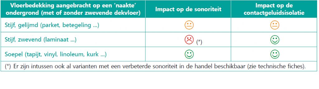 Zoals blijkt uit onderstaande tabel, kan de impact van de vloerbedekking op de sonoriteit van de ruimte en de contactgeluidsisolatie verschillend zijn. Zo zal een stijve, zwevend geplaatste vloerbedekking een doeltreffende contactgeluidsisolatie bieden, maar tegelijk ook een negatieve weerslag hebben op de sonoriteit in de ruimte. Het is daarom van groot belang om de keuze van de vloerbedekking af te stemmen op de aspecten die men als prioritair beschouwt.