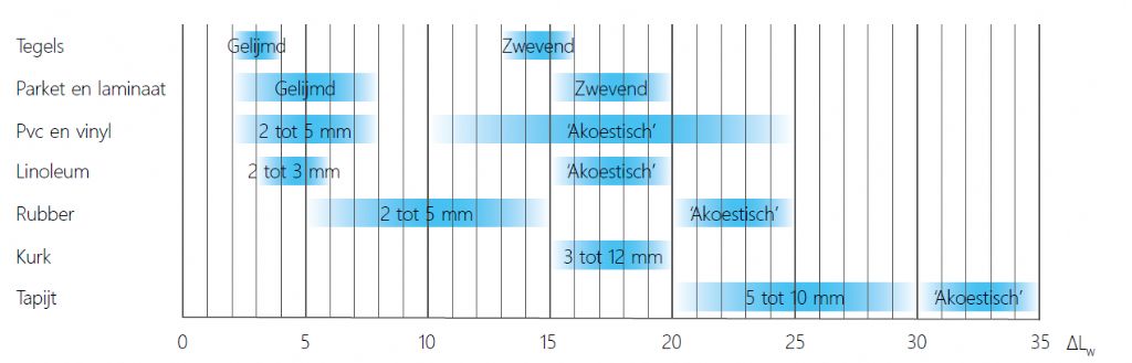 Bovenstaande grafiek toont enkele indicatieve ΔLw-waarden voor de meest courante vloerbedekkingen. Deze prestaties kunnen sterk variëren binnen eenzelfde afwerkingstype en dit, afhankelijk van de structuur van het product (samenstelling, dikte en aard van de lagen ...).