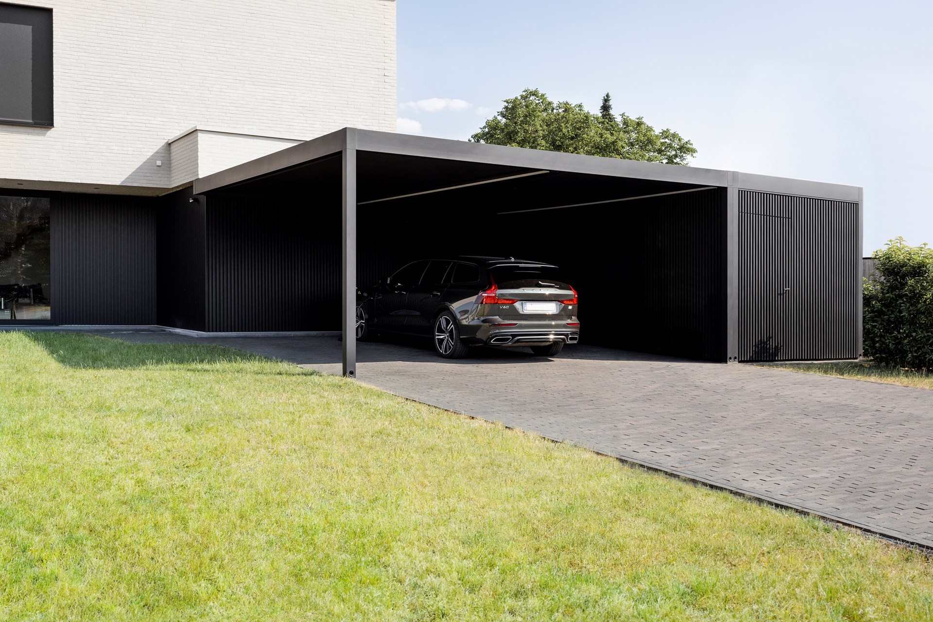 Met de berging afgewerkt in verticale aluminium Linarte lamellen van Renson, zit je volledige overkapping of carport in hetzelfde kleedje: strak afgewerkt in dezelfde kleur, en makkelijk te onderhouden. Naast de basisstructuur van de prefab wanden krijg je voor de afwerking met dit gevelbekledingssysteem van Renson meteen ook de horizontale dragers, bevestigingsclips en profielen op maat meegeleverd. Je hoeft ter plaatse enkel nog alles vast te schroeven en te klikken voor een perfecte afwerking.