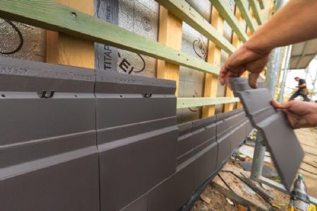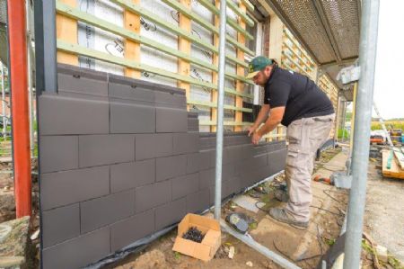 De wanden worden geïsoleerd met 20 cm Powerwall. Die isolatie wordt geschrankt geplaatst in 2 lagen van 10 cm en loopt continu door achter het houten regelwerk, waarop de Façatile-kleipannen worden bevestigd, zodat koudebruggen worden gebannen. De combinatie van deze twee isolerende en brandveilige isolatieproducten garandeert een doorlopend isolatieschild over de gehele woning.