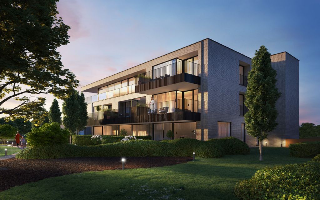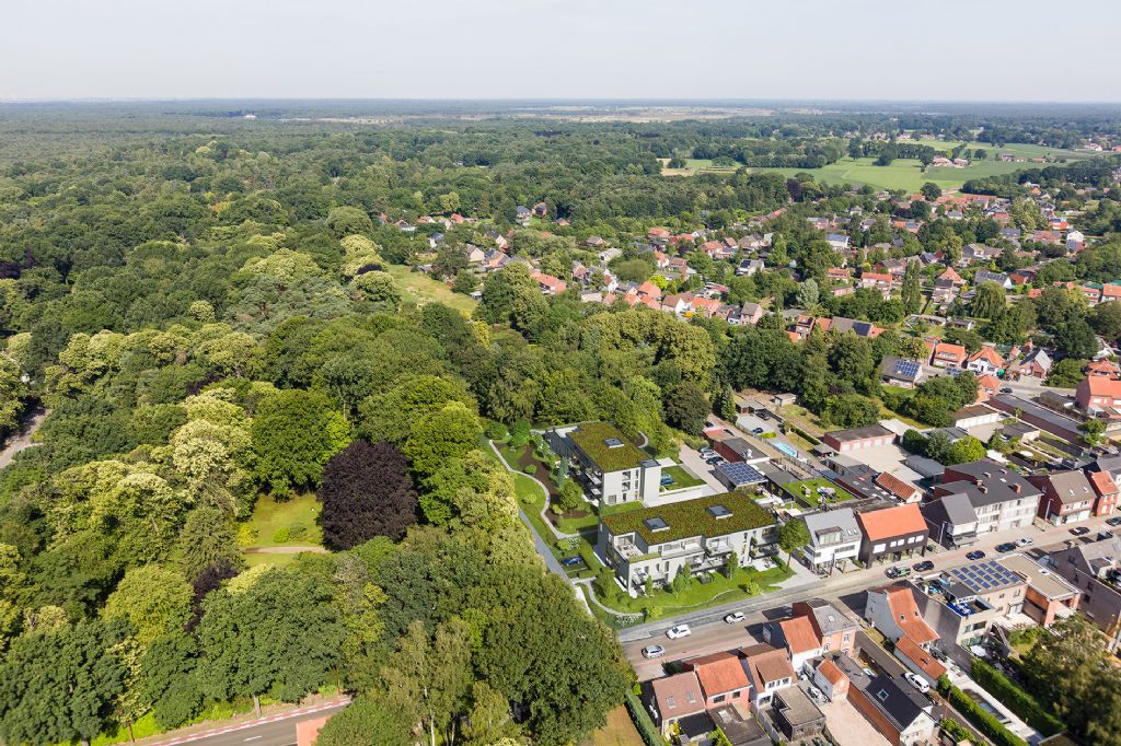 Er werd gekozen voor een lichte, frisse gevelsteen om vooral de natuur te laten opvallen, niet de gebouwen. In het ontwerp wordt ook veel aandacht geschonken aan oriëntatie van de ruime terrassen. Die zijn zo veel mogelijk gelinkt aan de bosrijke omgeving. Het gebouw dat het dichts bij het achterliggende bos ligt, bouwt bovendien af richting dat bos zodat de overgang naar het groen niet te bruusk is. “We weken in ons ontwerp bewust af van de klassieke bouwmogelijkheden die het perceel had door ervoor te kiezen de gebouwen weg te trekken van de straat. Zo creërden we een woonproject mét ademruimte ondanks de ligging in de dorpskern. Op die manier trekken we het naastgelegen bos ook binnen in het woonproject”, vertel Gert Van Ginneken van het Kalmthoutse VGArchitecten bvba.