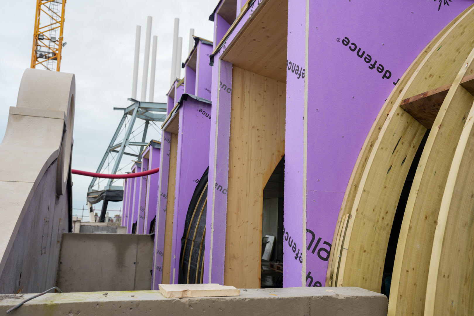 “De Weather Defence-platen worden gebruikt omwille van verschillende redenen”, zegt Bert. “In de eerste plaats voor het brandwerend afschermen van de houtstructuur om zo spouwbranden te vermijden. Daarnaast is deze plaat vochtbestendig, waardoor ze tot drie maanden probleemloos blootgesteld kan worden aan weersinvloeden alvorens ze bedekt wordt met de uiteindelijke gevel. En geen onbelangrijk detail: de plaat houdt ook ongewenste knaagdieren en insecten buiten.”