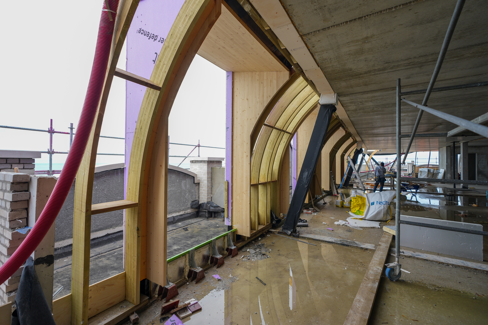Rond de patio werd gewerkt met houtskeletwanden, ontwikkeld door Etex Building Performance, die brandwerend getest zijn tot 120 minuten. Afhankelijk van de locatie en gewenste brandweerstand varieert de opbouw. Doorgaans bestaan de gevelwanden uit een binnenafwerking met Ladura Premium en als buitenplaat Weather Defence of Promatect-100 brandwerende platen en Promat-houtskeletwanden.