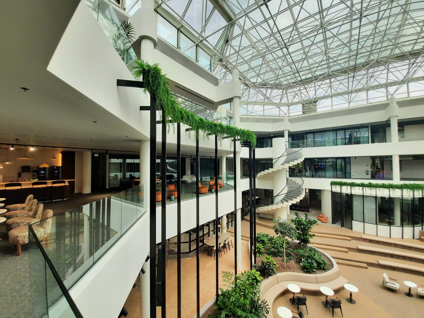 Op energetisch vlak lag de lat bijgevolg erg hoog. Het doel was om een fossielvrij BEN-gebouw met een BREEAM Very Good-rating te creëren. In functie daarvan zijn de bestaande technische installaties volledig vernieuwd. “Waar de kantooromgeving vroeger op temperatuur gebracht werd met een gasgestookte installatie, gebeurt dat nu op basis van geothermie. Daarvoor voerde aannemer Keulen de nodige grondboringen uit rond het gebouw. De klassieke ventiloconvectoren maakten plaats voor SAPP-klimaatplafonds die zowel kunnen verwarmen als koelen. Uiteraard liggen er ook zonnepanelen op het dak. Het was puzzelen om alle benodigde leidingen en kanalen in te passen in de bestaande structurele context. Gelukkig was er voldoende vrije hoogte tussen de verschillende vloerniveaus, waardoor er genoeg ruimte overbleef onder de valse plafonds, en konden we – door een aanpassing van enkele bestaande vloerdozen, die destijds mee in de chape waren gestort – een stramien creëren dat de nodige flexibiliteit bood. Bovendien is ook de iconische glasgevel volledig vernieuwd en uitgerust met superisolerend glas, wat zowel het thermisch als het akoestisch comfort ten goede komt. Tot slot is ook het dak vervangen”, legt Eric Delgoffe uit.