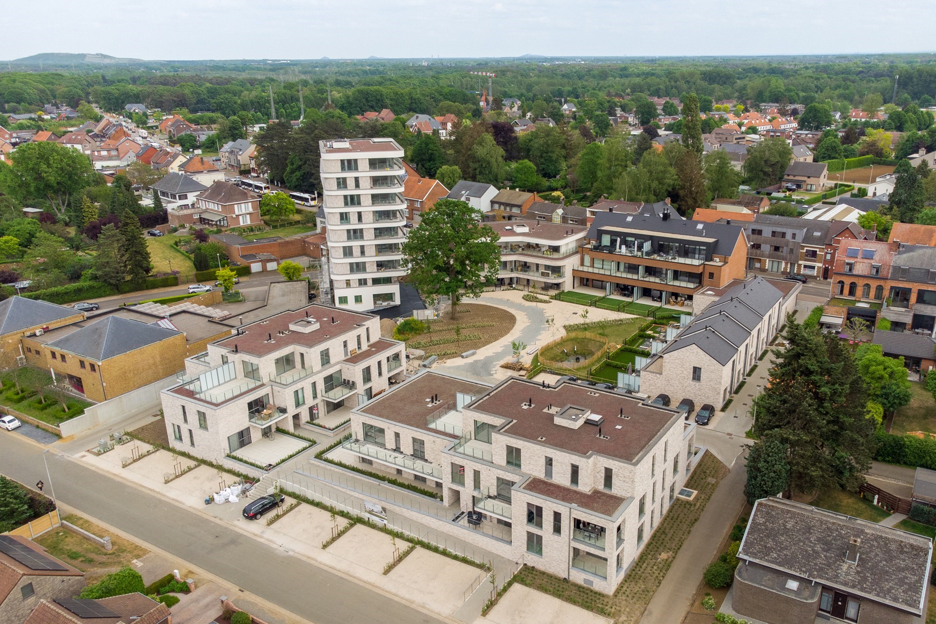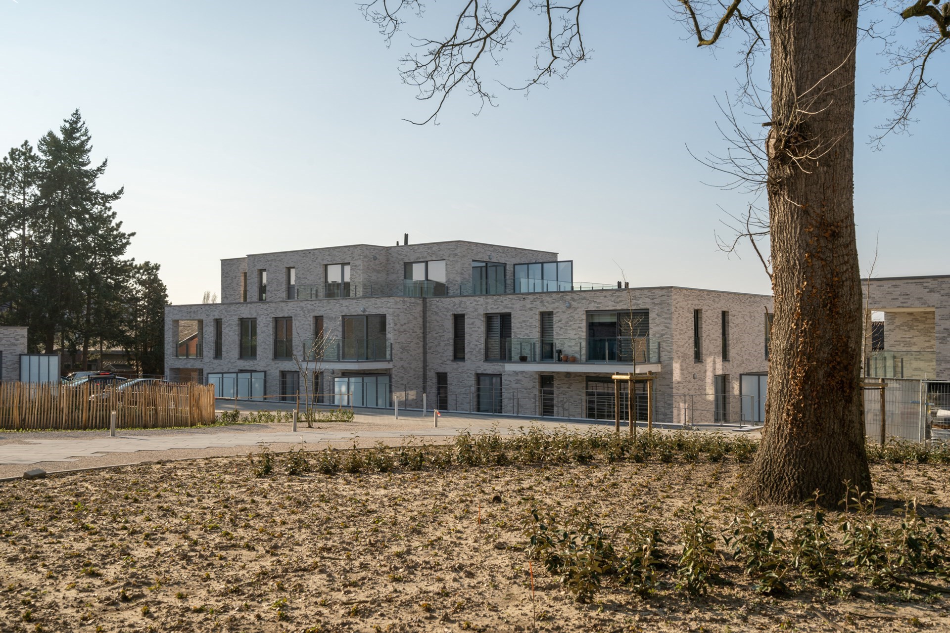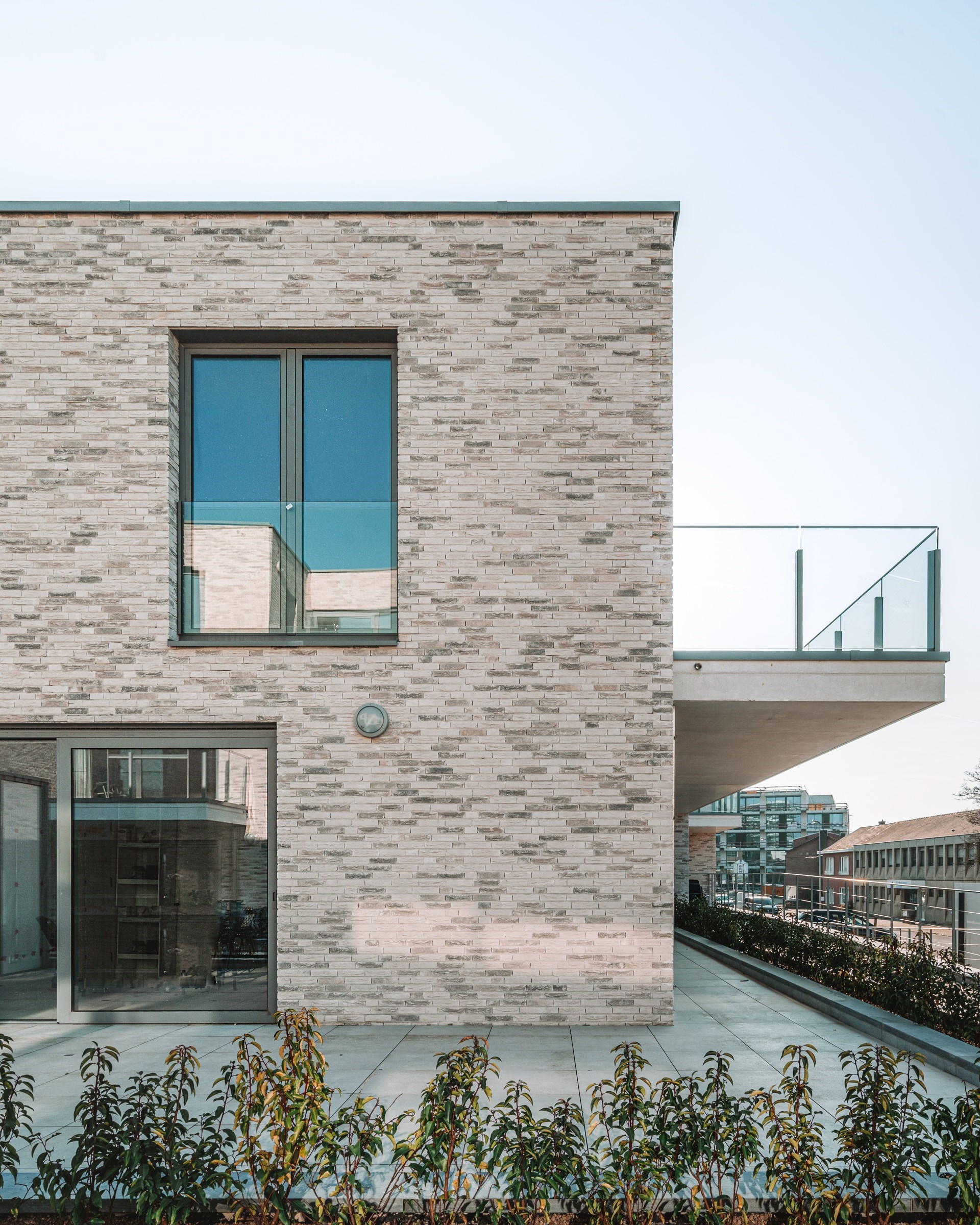 Deze karakteristieke vormentaal keert terug in het aanpalende woongebouw met twaalf appartementen (blok 2). Daarnaast bevinden zich de gerenoveerde rijkswachtwoningen (blok 1), die voortaan plaats bieden aan tien appartementen. “Aangezien de voorgevel deel uitmaakt van een beschermd dorpszicht, hebben we hem behouden”, zegt Filip Rommens. “De zijkanten zijn opnieuw opgemetst met oranjerode recuperatiestenen en de gesloten geveldelen aan de achterzijde zijn gerealiseerd in bijpassende nieuwe bakstenen. Een schakelvolume met grondgebonden kantoorruimte, dat qua look-and-feel opnieuw aansluit bij de toren, legt de link met vijf eengezinswoningen (W1-5) die in de plaats van de voormalige rijkswachtkazerne kwamen. Tot slot zijn er aan de kant van de Sint-Catharinastraat nog twee urban villa’s met respectievelijk twaalf appartementen (blok 4) en veertien appartementen (blok 5) opgetrokken. De gevels van de eengezinswoningen en de urban villa’s zijn bekleed met horizontale gevelstenen. Qua materialisatie is er dus sprake van eenheid in verscheidenheid.”