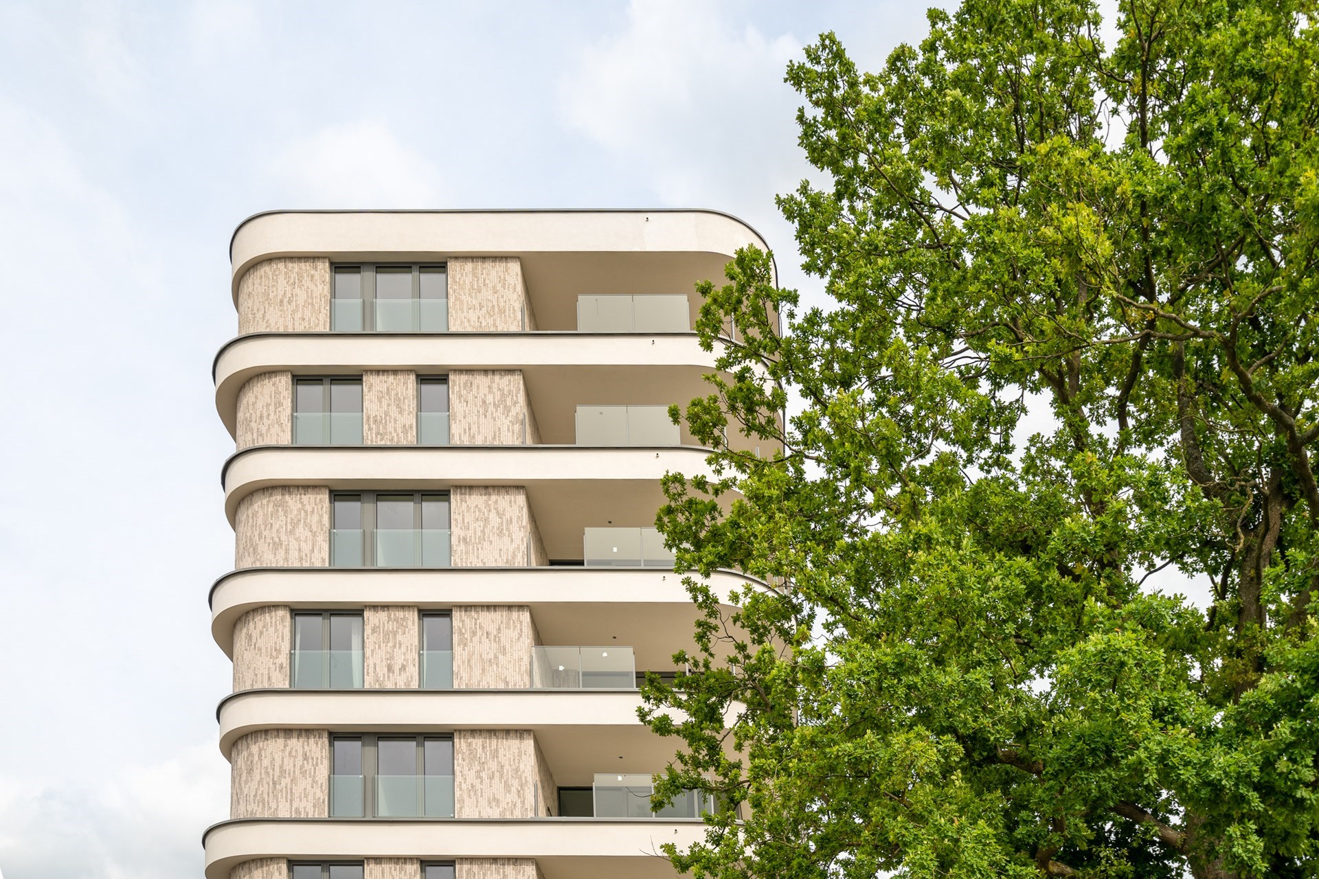 B-Blocks bestaat uit zeven gebouwen, die samen plaats bieden aan 65 appartementen met oppervlaktes van 66 tot 113 m² en vijf eengezinswoningen met een gemiddelde woonoppervlakte van 120 m². Aangezien de toren aan de Koerselsesteenweg de eyecatcher van het project moest zijn, kreeg hij een bijzondere vormentaal. “De toren (blok 3) herbergt zeventien appartementen en een gelijkvloerse handelsruimte. Hij telt negen bouwlagen, die zich subtiel schranken ten opzichte van elkaar. In combinatie met de horizontale geleding en afgeronde hoeken van de verschillende vloerniveaus leidde dit tot een vloeiende, dynamische uitstraling. Qua gevelafwerking hebben we geopteerd voor een mix van witte buitenbepleistering en verticale steenstrips”, legt Filip Rommens uit.