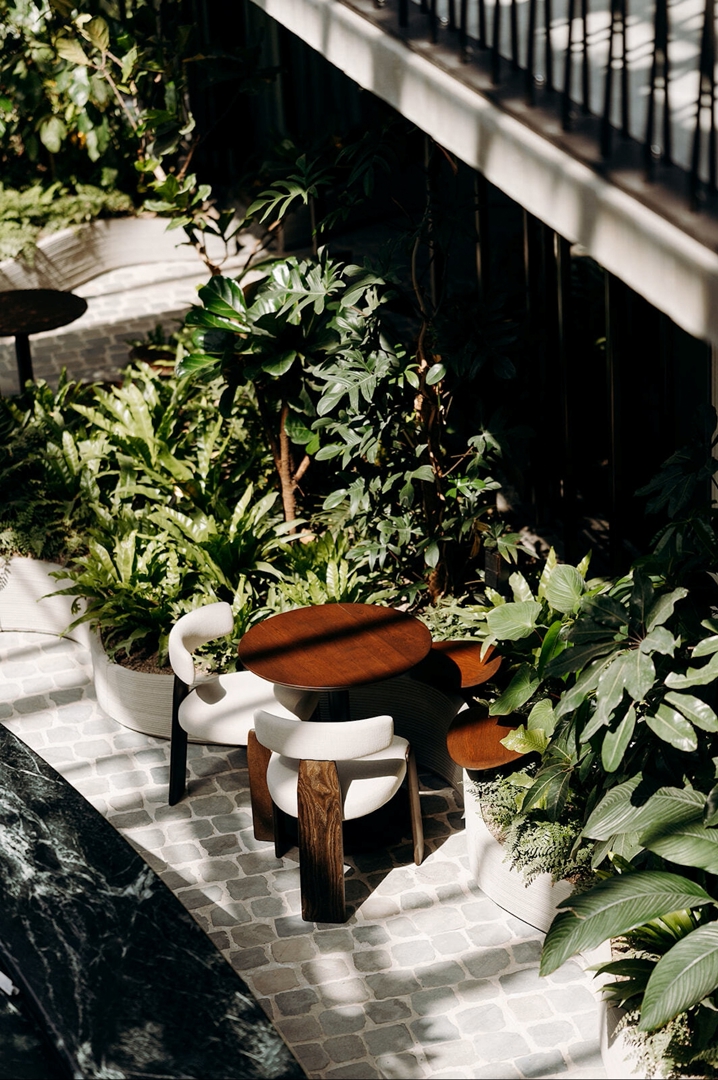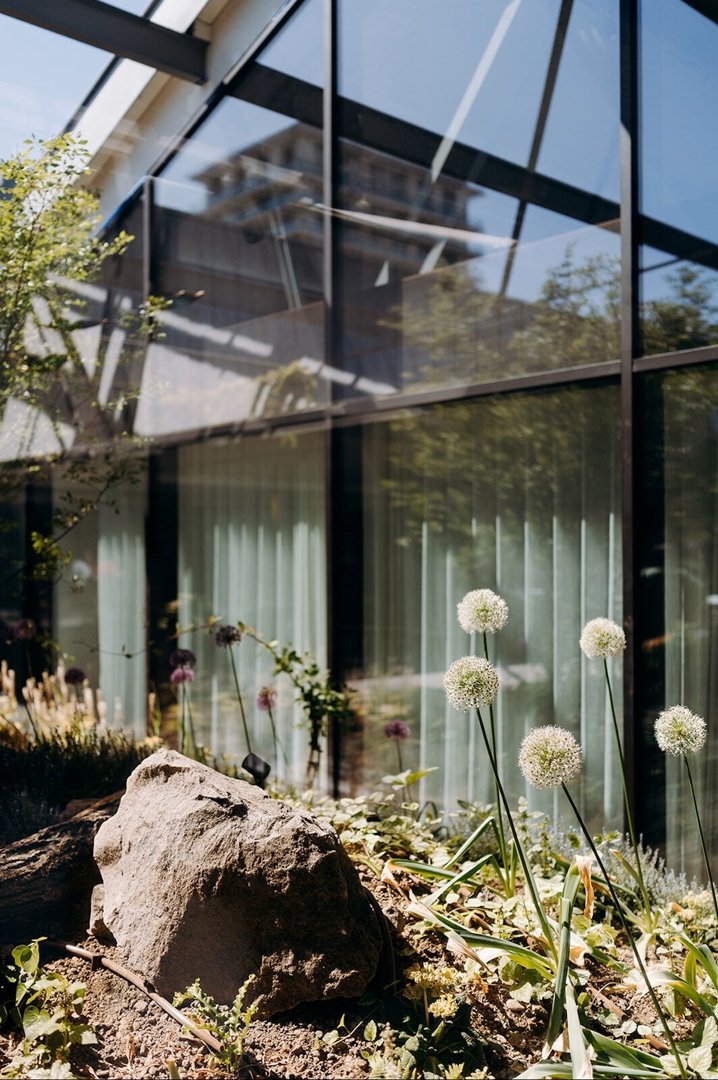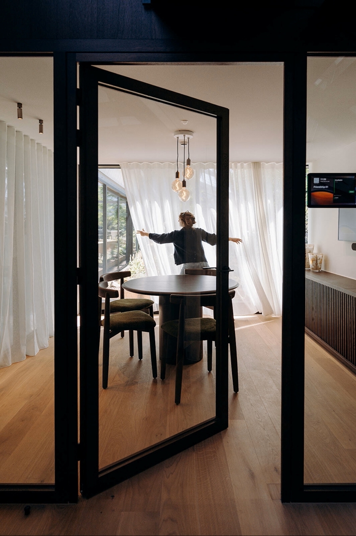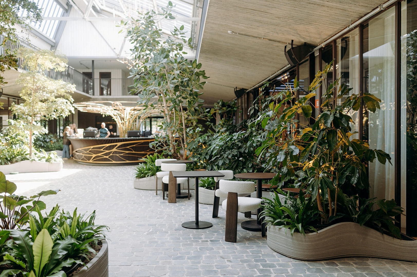 De ontwerpers speelden met licht, schaduw, textuur en materiaal om een warme, mysterieuze sfeer te creëren die authenticiteit en ambacht uitstraalt. Rijke houtstructuren en diepe, stemmige tinten domineren het interieur, waardoor een gevoel van ingetogen weelde ontstaat. Deze ontwerpkeuzes verankeren de identiteit van Tomorrowland in het gebouw, zonder in visuele clichés te vervallen. De sfeer is tegelijk sereen en inspirerend, met ruimtes die aanzetten tot concentratie én ontmoeting.
