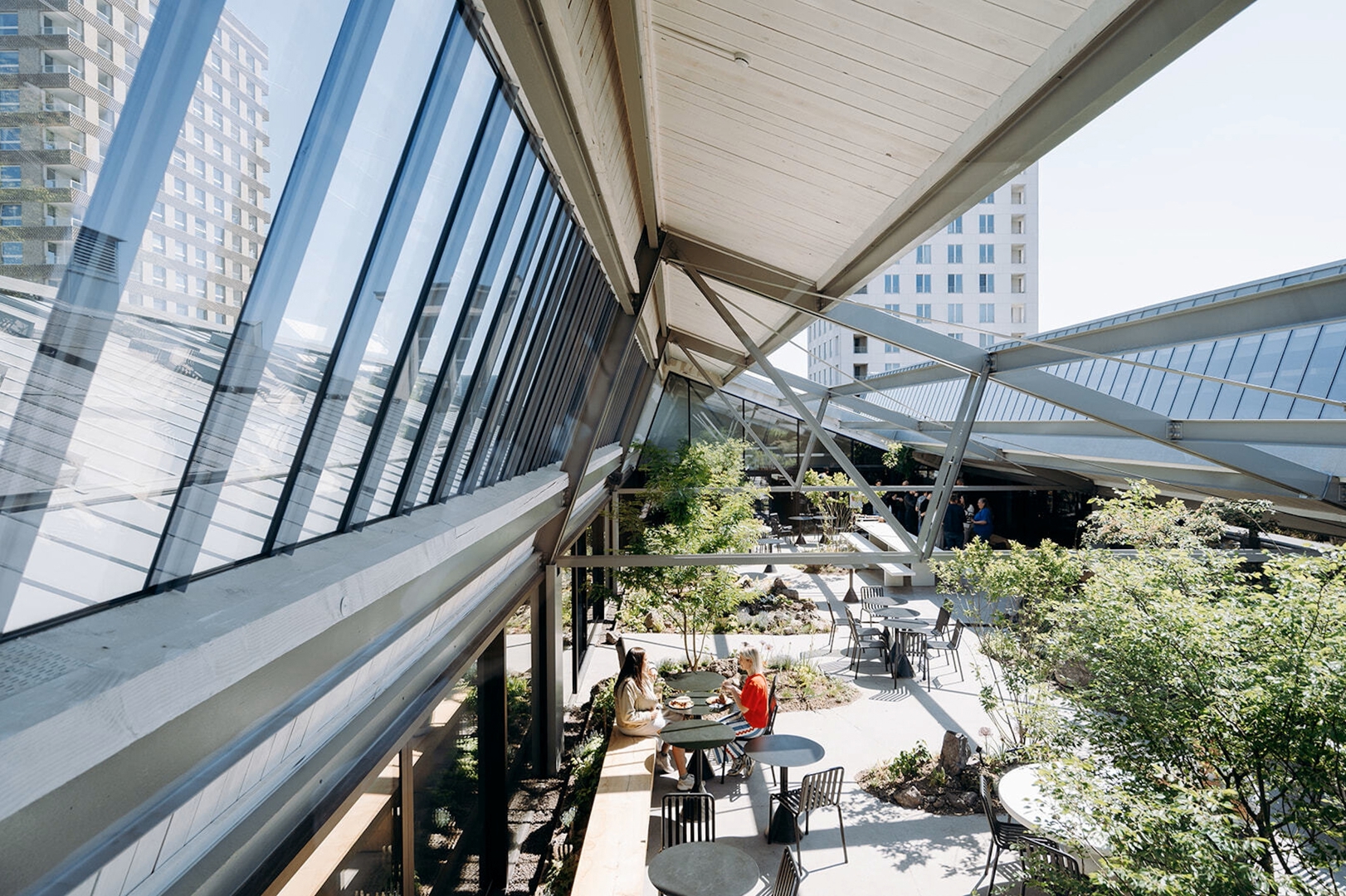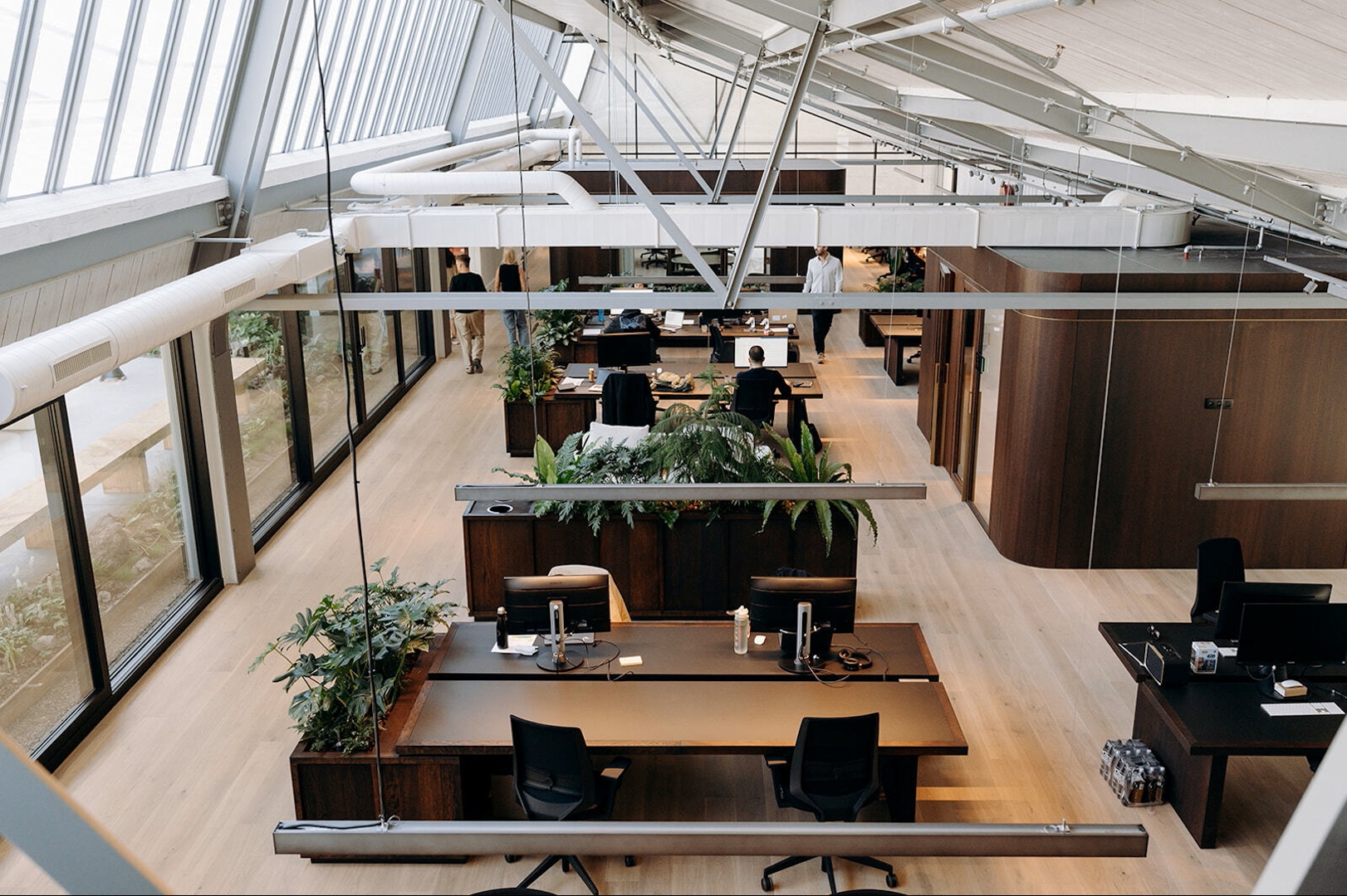 Het hoofdkantoor maakt deel uit van een flexibele werkplek die uiteenlopende typologieën samenbrengt: open werkzones, stille focusplekken, informele zithoeken, een centrale bar voor spontane gesprekken en een royaal dakterras. Die opstelling stimuleert niet alleen interactie, maar ondersteunt ook de wisselende noden van creatief werk. Door de menging van functies ontstaat een ecosysteem waarin ideeën vlot kunnen circuleren en teams elkaar voortdurend kunnen uitdagen.